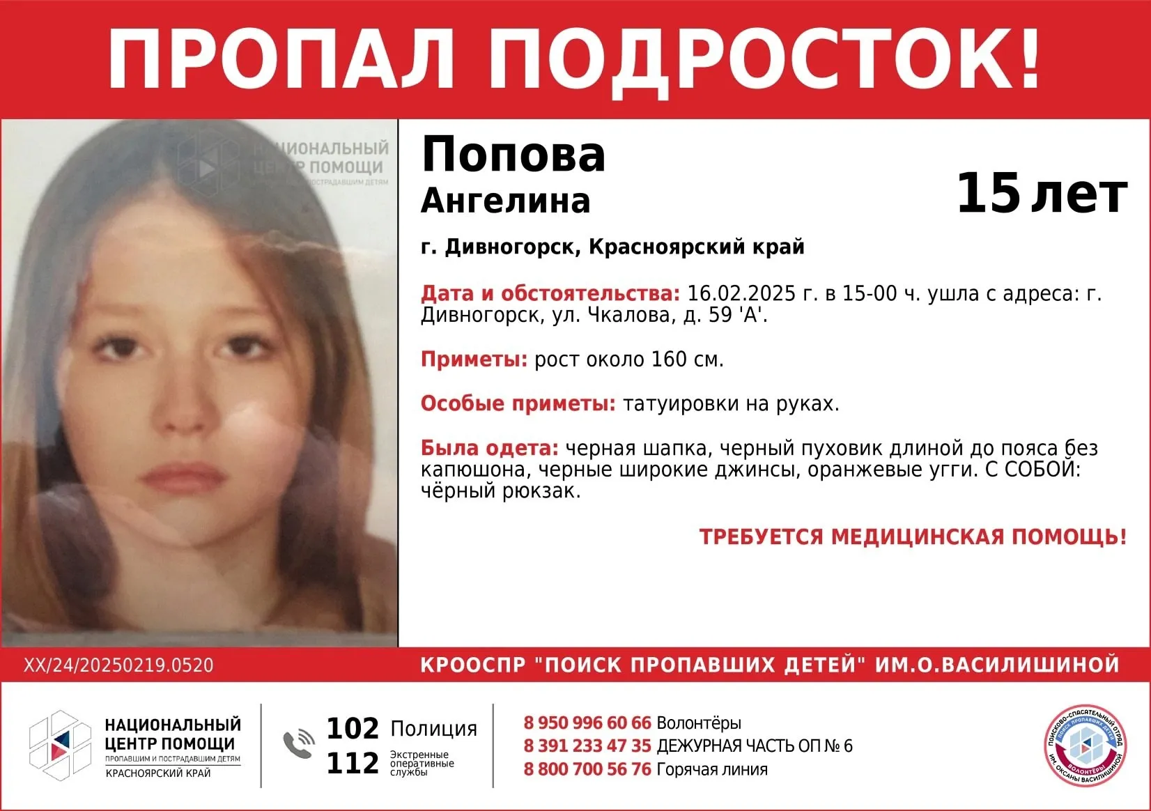 В Дивногорске пропала 15-летняя Ангелина Попова.