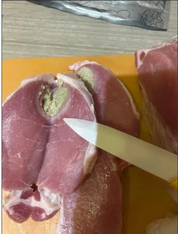 Специалисты провели проверку, и установили, что включение – это абсцесс, то есть гнойник. Просмотрены были и ветеринарные сопроводительные документы: цепочка отслеживаемости товара прервалась на службе доставки.