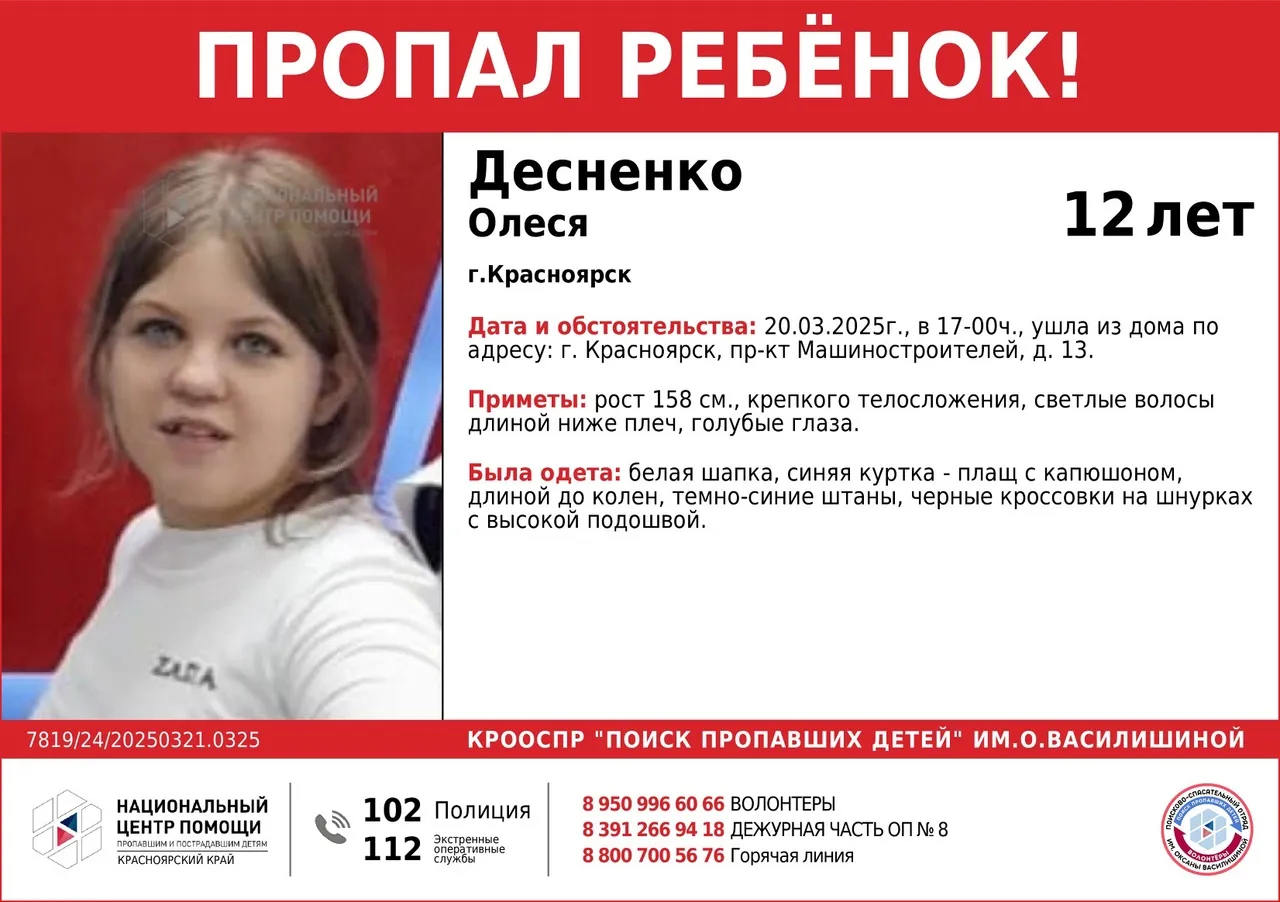 Если вы видели девочку, звоните: 8 (391) 266-94-18, 8-950-99-66-066 (круглосуточно), 112.
