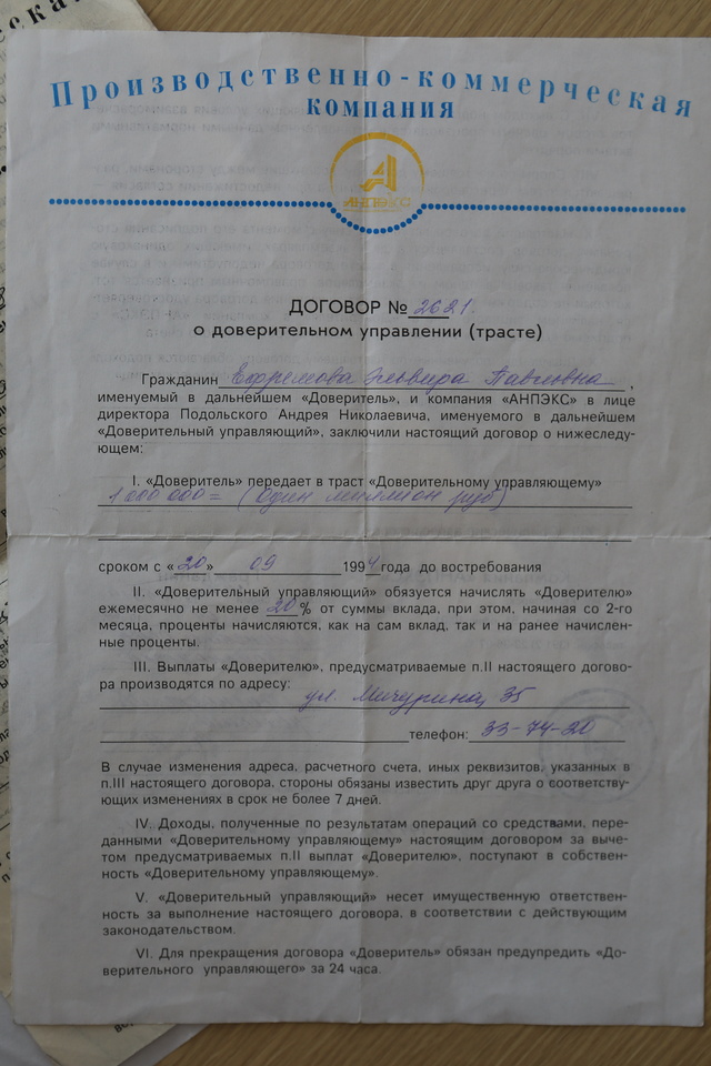 — Деньги “Анпэксу” мы отдали в октябре 1994 года, — вспоминает Эльвира Ефремова. — Условия были самые заманчивые — 20 процентов в месяц от суммы вклада. Если же мы соглашались не забирать доход по вкладу, то проценты обещали начислять на всю сумму, накопившуюся на счёте. Я отдала один миллион рублей, а Валентина Ивановна — 750 тысяч.