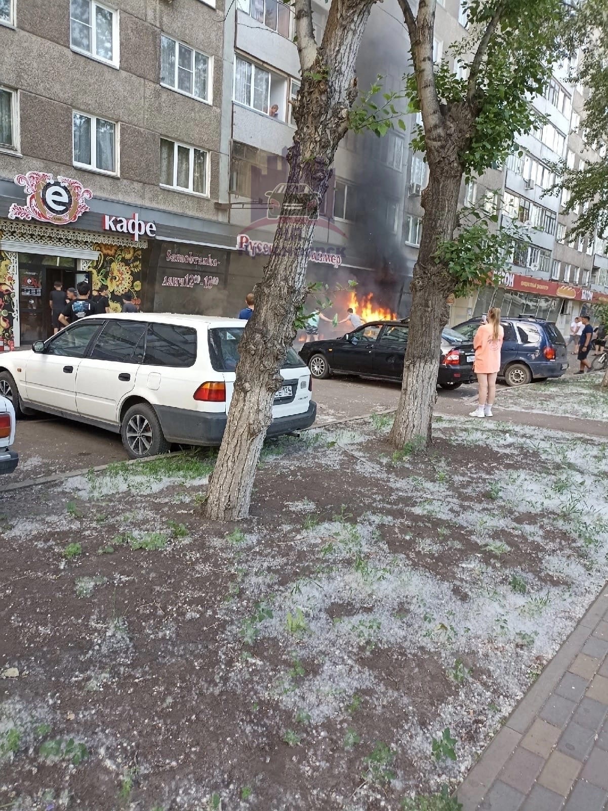 Очевидцы в группе «ЧП Красноярск» сообщают, что кто-то поджог тополиный пух, затем пожар перекинулся на кафе.