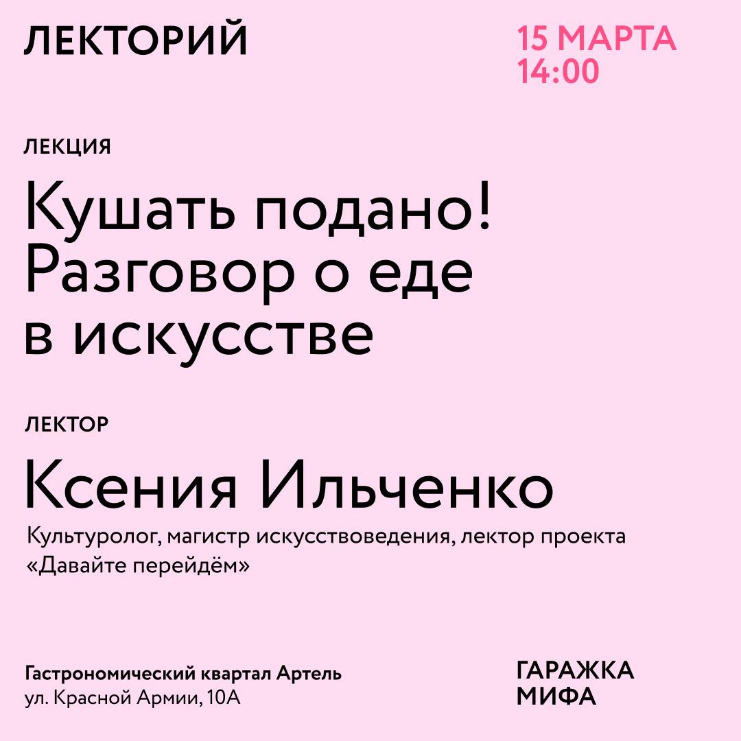 - 15 марта, 14:00 — разговор о еде в искусстве с культурологом Ксенией Ильченко;