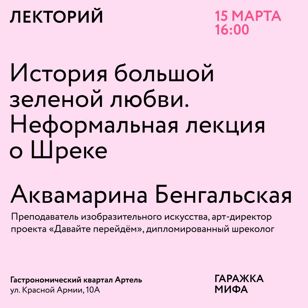 - 15 марта, 16:00 — неформальная лекция о Шреке: «История большой зелёной любви»