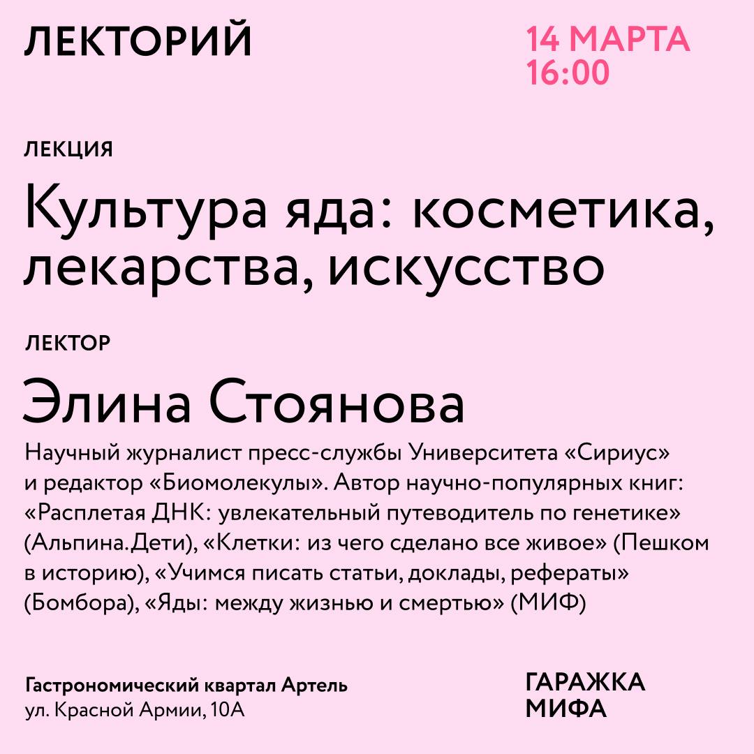 - 14 марта, 16:00 — «Культура яда: косметика, лекарства, искусство» с научным журналистом Элиной Стояновой;