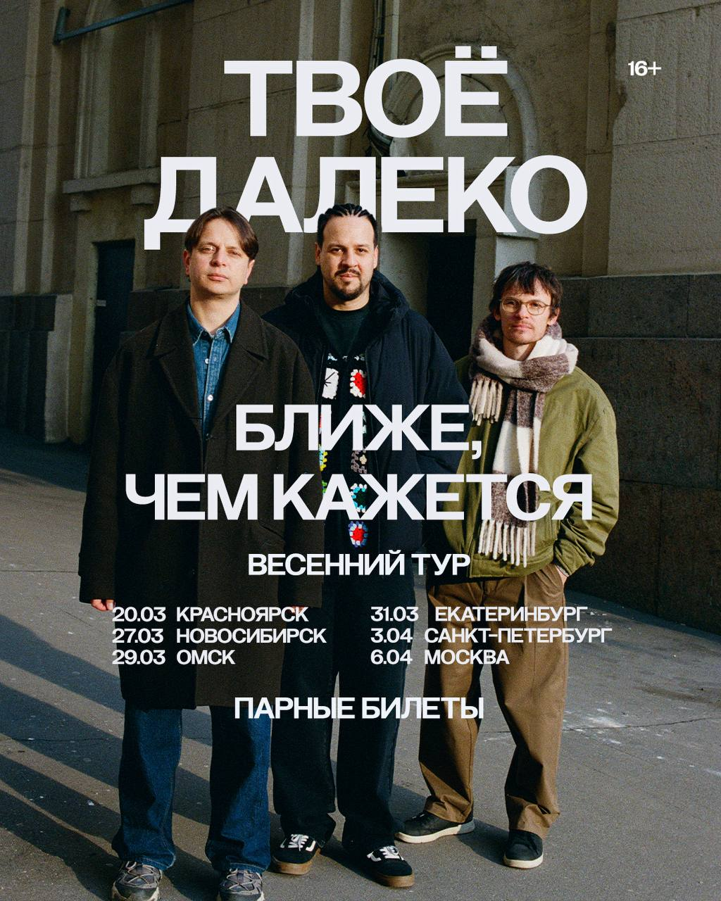 Красноярско-московско-токийская, нежно любимая всеми возрастами группа «Твоё далеко» начинает весенний тур с родного города. Из Красноярска группа отправится в Новосибирск, Омск, Екатеринбург, Петербург и Москву. 6+