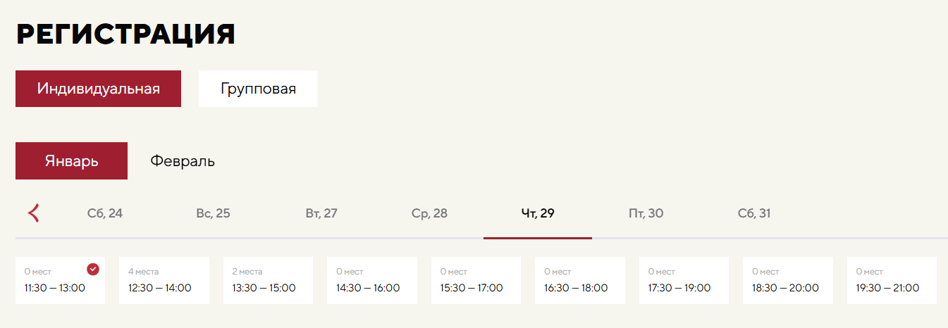 В Национальном центре «Россия» продолжатся интерактивные экскурсии по экспозиции, посвященной Красноярскому краю. Они проходят бесплатно по регистрации. Свободные временные слоты видны на сайте (см. скриншот) Желающих много, поэтому зарегистрироваться лучше заранее. Например, прямо сейчас.