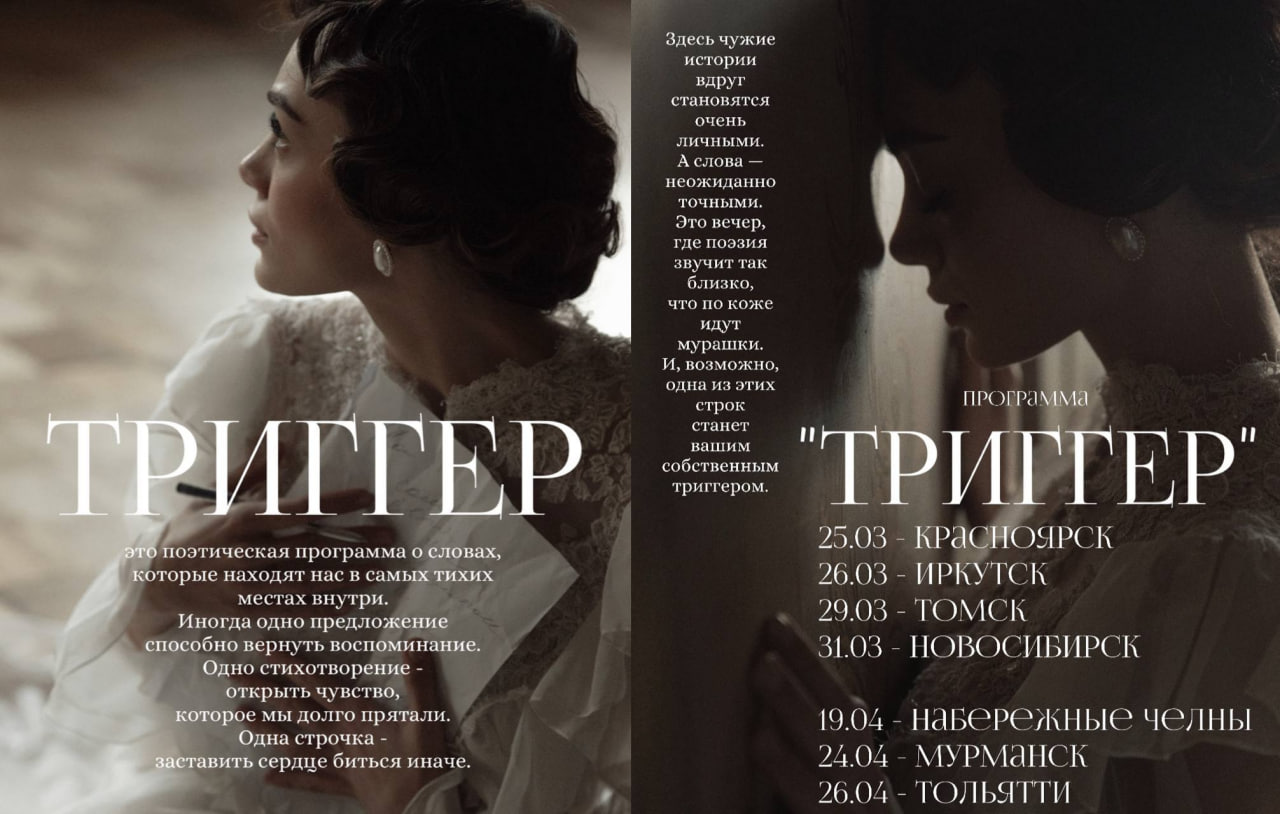 В среду на сцену ДК Комбайностроителей выйдет Анна Егоян. Поэтесса и чтец, она исполнит программу «Триггер» — зрителей ждёт откровенный диалог со временем, памятью и внутренними импульсами, которые запускают глубинные чувства.