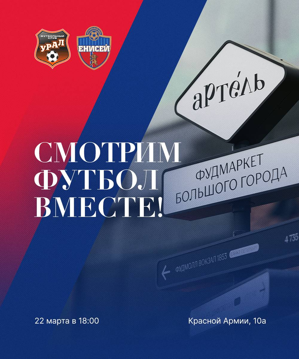 Футбольный клуб «Енисей» в воскресенье играет на выезде: команда встретится с «Уралом» в Екатеринбурге. Красноярских болельщиков приглашают смотреть матч вместе в фудмолле «Артель». Клуб подготовил конкурсы с призами и автограф-сессию с нападающим Лукой Ратковичем. Он будет ждать всех в 17:30. Вход свободный, бронировать столы не нужно.