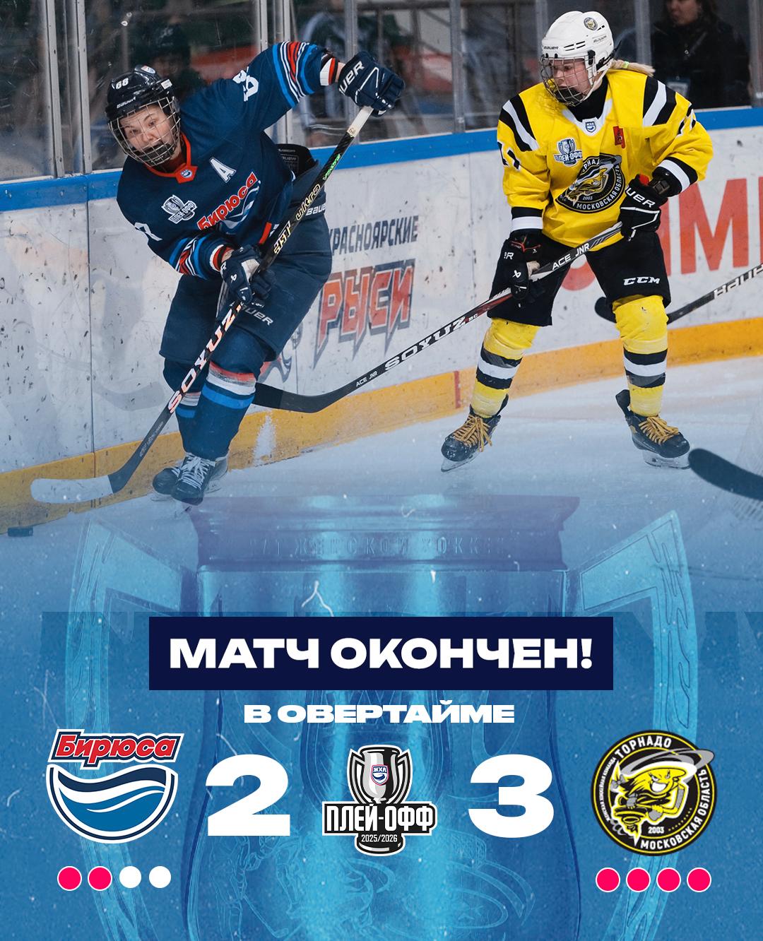 Матч завершился со счётом 2:3. Красноярки вели на протяжении двух периодов. В третьем периоде «Торнадо» отыгрались с 0:2, а затем обыграли «Бирюсинок» в овертайме.