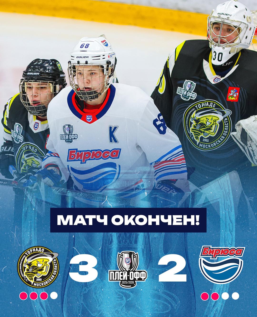 Хоккеистки «Бирюсы» на выезде уступили соперницам из Воскресенска. В пятом матче полуфинальной серии красноярки пропустили три шайбы уже в первом периоде. Затем два гола забили Вероника Барцайкина и Полина Архипова. Счёт в серии так же 3:2 в пользу «Торнадо».