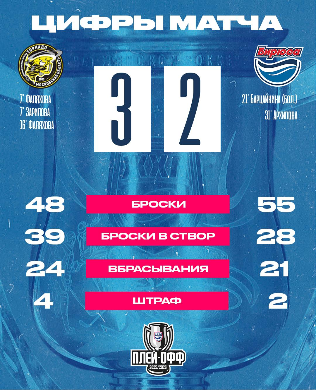 Следующая игра пройдёт 1 апреля в 19:00 без права на ошибку. «Бирюса» примет «Торнадо» на домашнем льду. Спортсменкам нужна поддержка на трибунах «Платинум Арены»! Напоминаем, что вход на матчи будет свободный.
