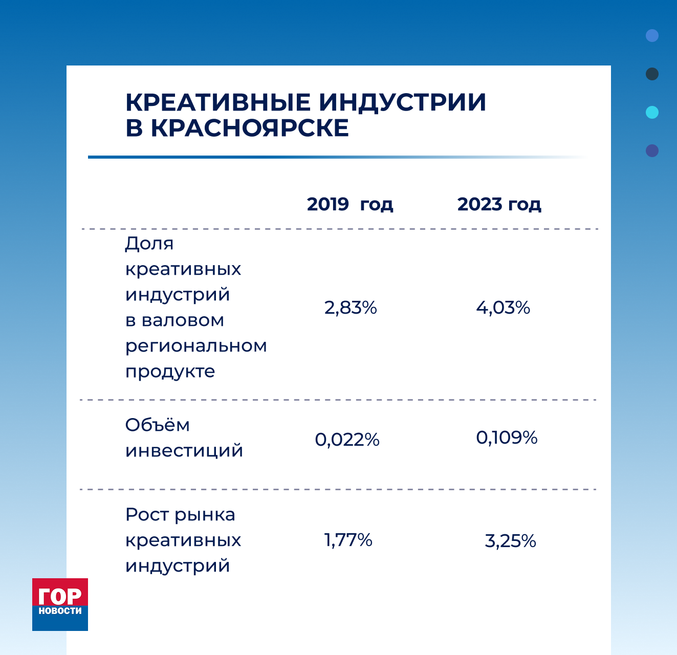 Доля креативных индустрий в ВРП Красноярского края составляет 4,03%. С 2019 года показатель также вырос в 1,5 раза. Конечно, это несравнимо с промышленным сектором, но это и не является нашей целью. Креативные индустрии выполняют другую функцию: они делают экономику более устойчивой, встраиваются и усиливают уже развитые отрасли и помогают выстроить привлекательный образ как отдельного города, так и всего региона.