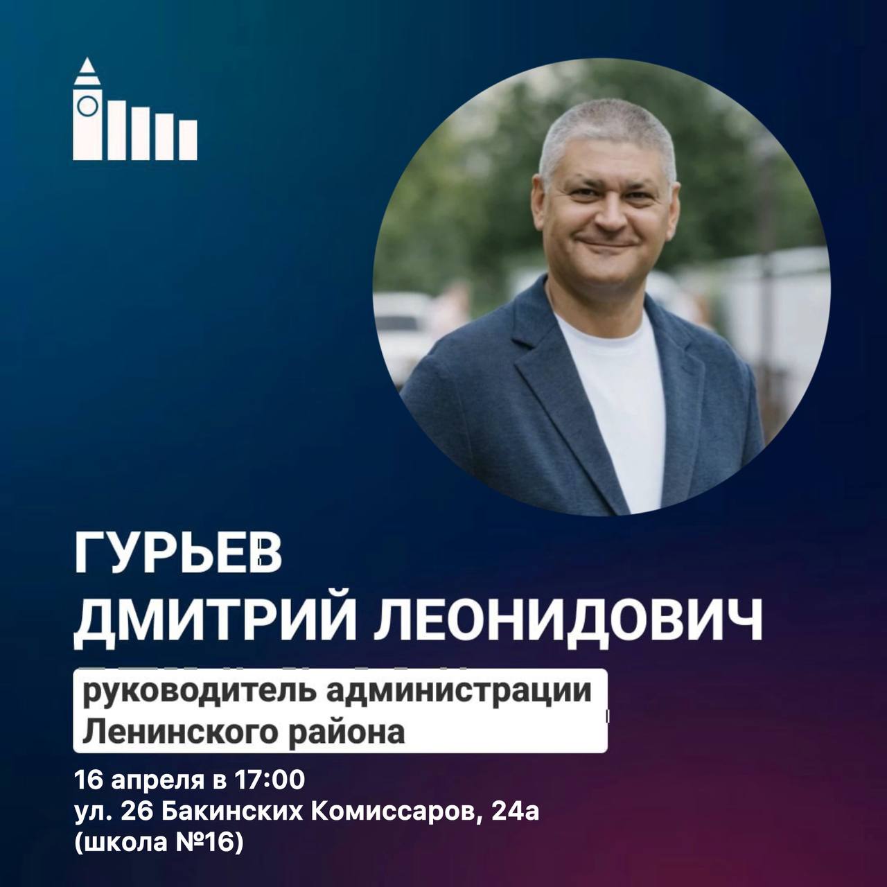 Глава Ленинского района Дмитрий Гурьев встретится с жителями. 16 апреля 17:00 он выслушает проблемы микрорайонов и возьмётся за их решение.