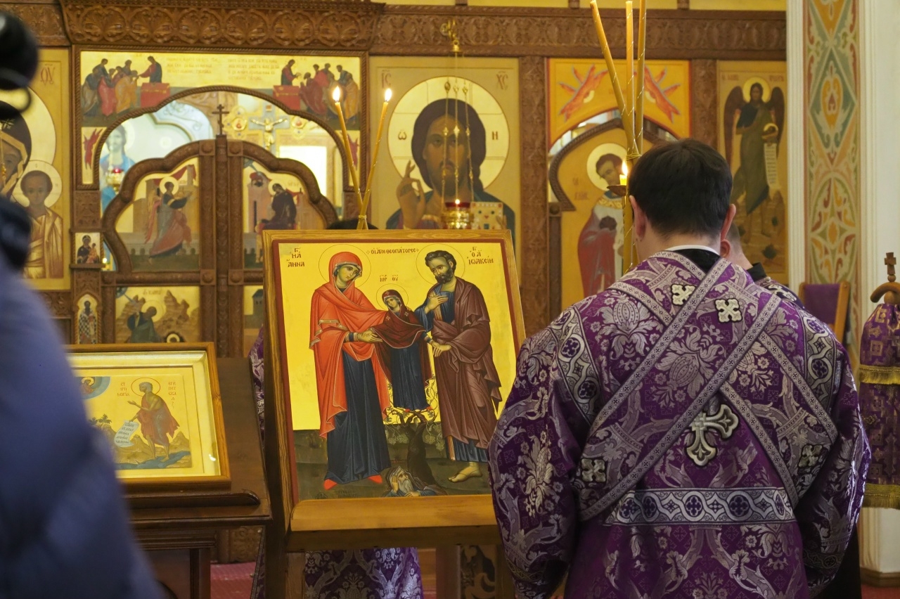 Икону святых праведных Иоакима и Анны, написанную на Афоне, доставили в Красноярск для строящегося храма на Стрелке. Теперь святыня находится внутри храма. Она останется там до конца строительства.