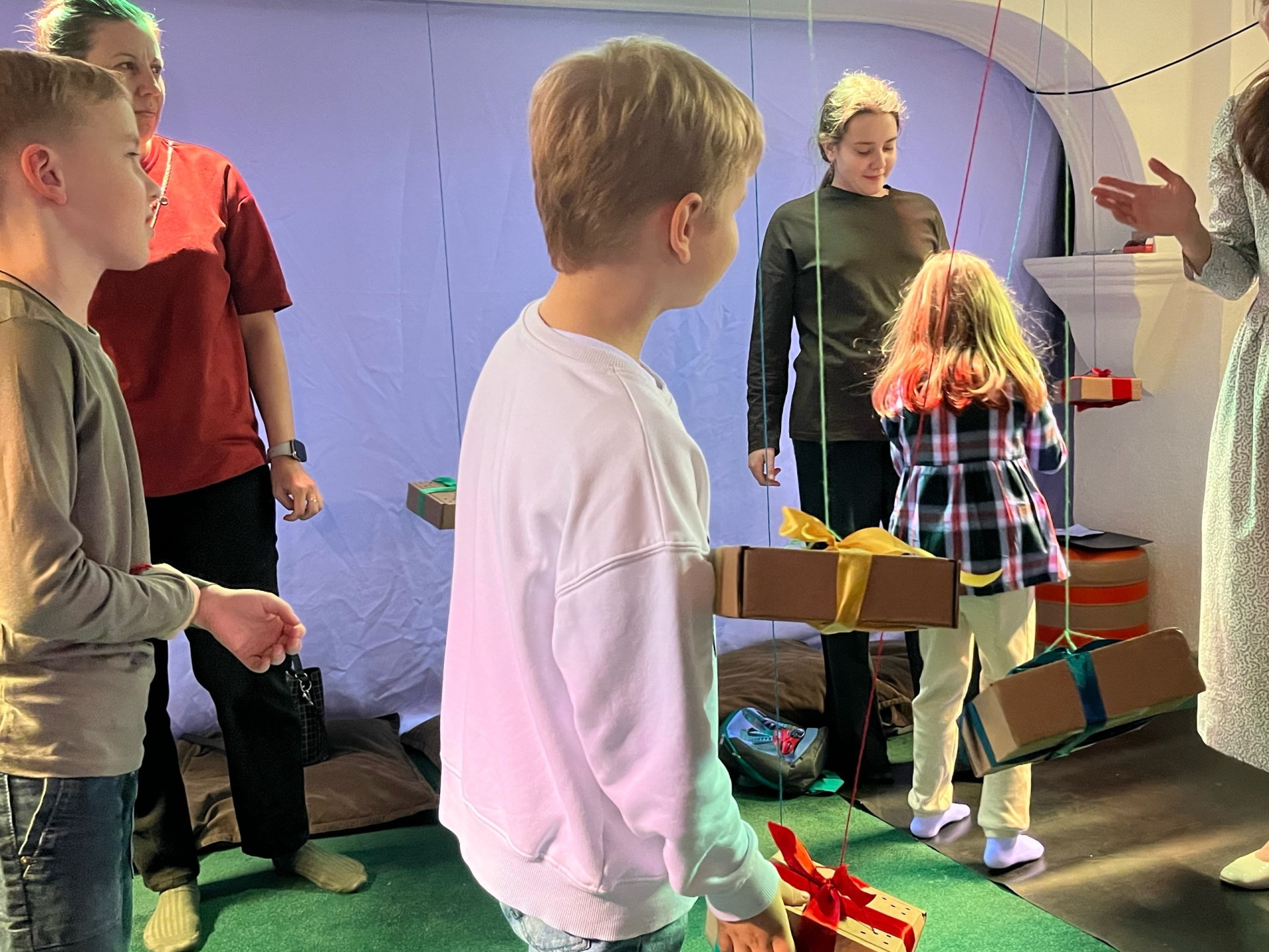 Коробочки с запахом вкусных пирогов, зубного порошка и грязного болота свисают на верёвочках с потолка второго этажа Красноярского театра кукол. Ребята и их родители, которые пришли на Ночь искусств, угадывают запахи, а по ним определяют, какая сказка Корнея Чуковского прячется в коробочке.