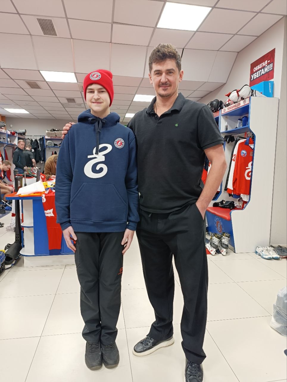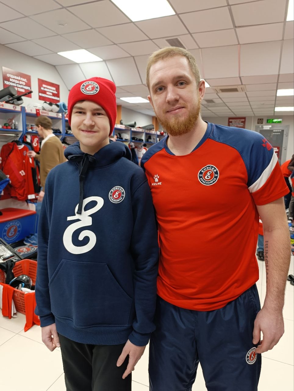 Особенного мальчика вместе с мамой пригласили в раздевалку красноярской команды. Марк пожал руку каждому игроку и подарил им маленький талисман на удачу. В ответ хоккеисты вручили ему свой подарок и полным составом расписались на его джерси.
