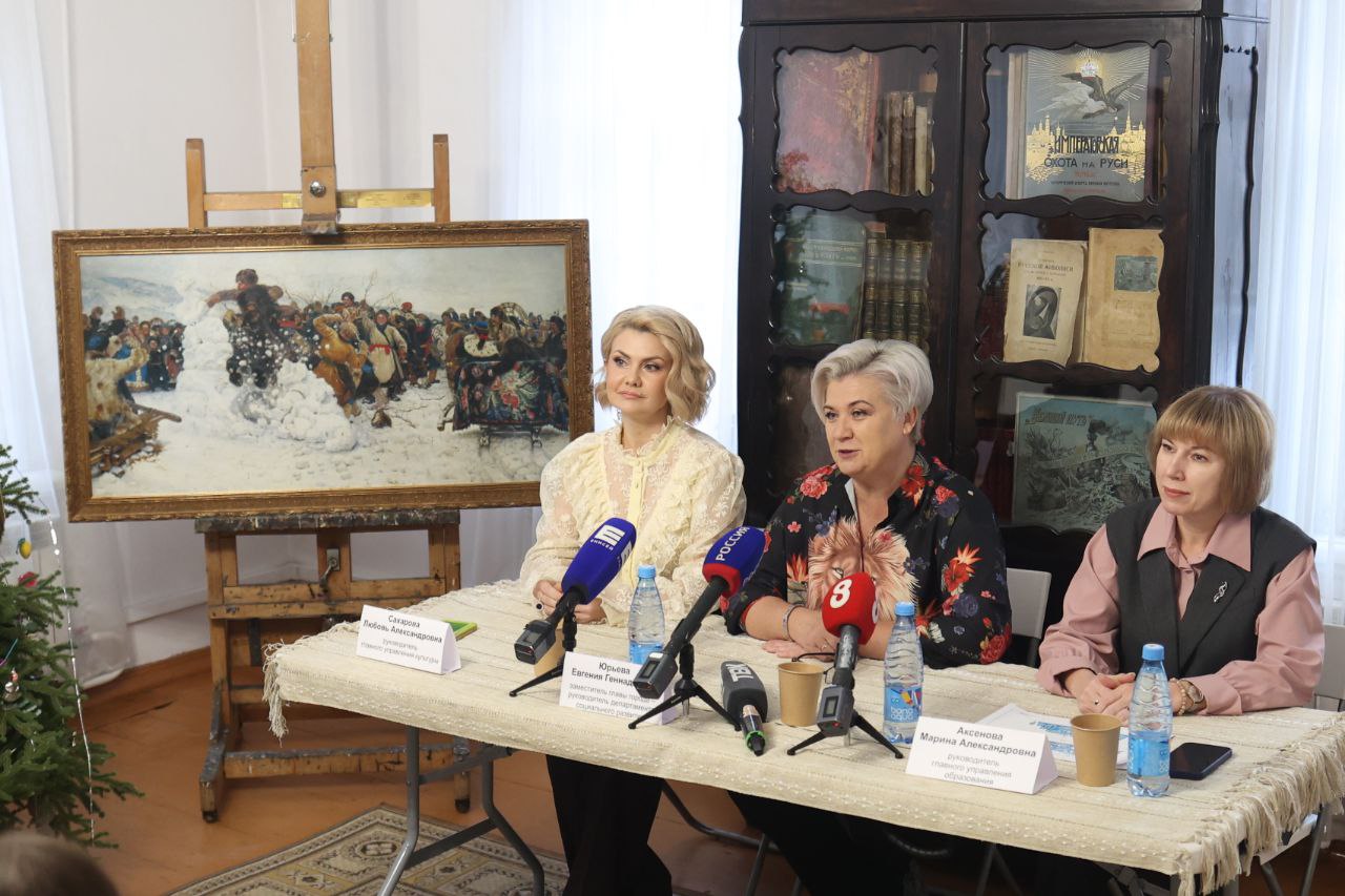 Местом встречи стал музей-усадьба Василия Сурикова — символично, ведь начало 2026 года в городе пройдет под знаком искусства и юбилейного, XX Зимнего суриковского фестиваля. Пресс-конференцию открыл ансамбль русской народной песни «Красный Яр», задав тон всей концепции праздника — «Зимний Яр».