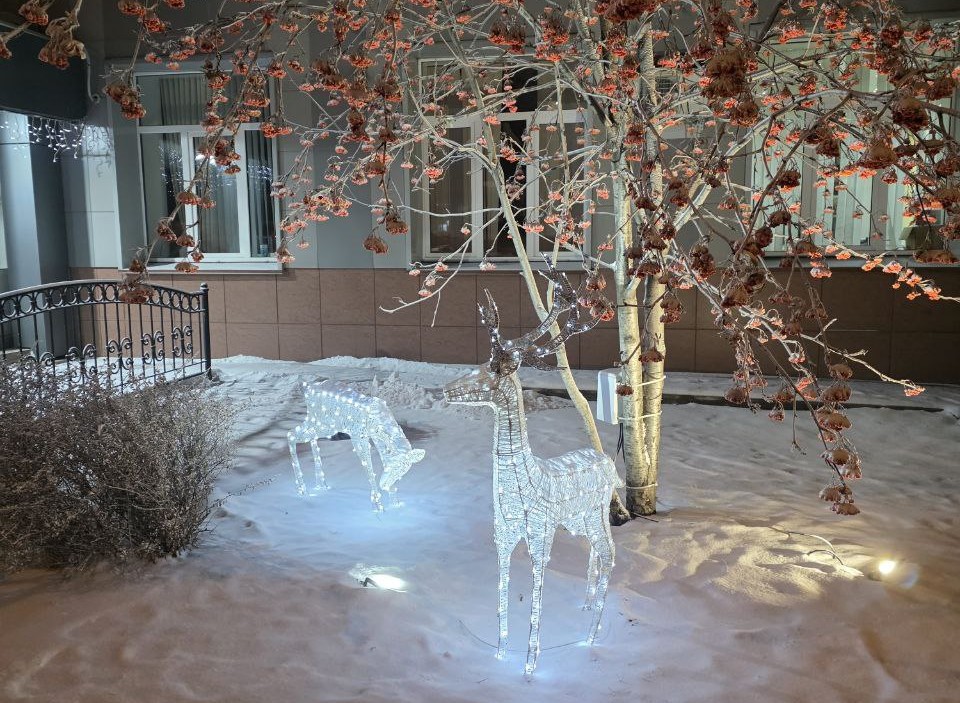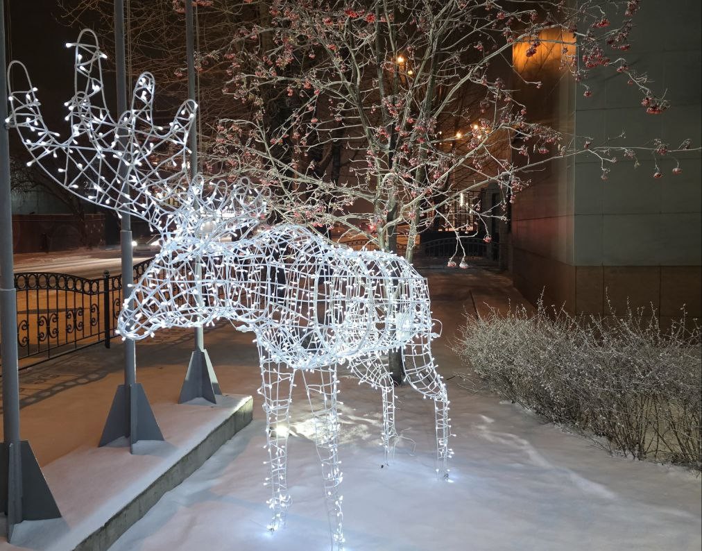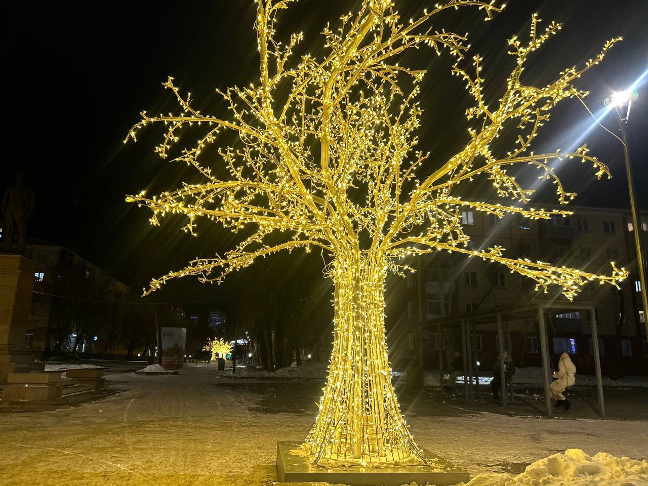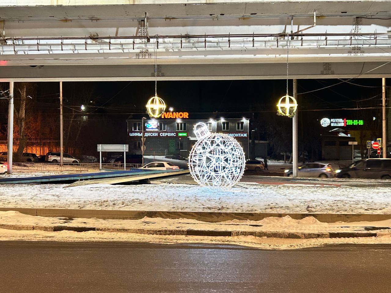 Новогодняя подсветка зажигается на улицах Брянской, Дубровинского, Маерчака, Лесников. На правом берегу деревья и фигуры животных украсили гирляндами. Яркие светящиеся олень и лось расположились рядом с Дворцом культуры «Свердловский», а большой светящийся шар установили у остановки «Школа».