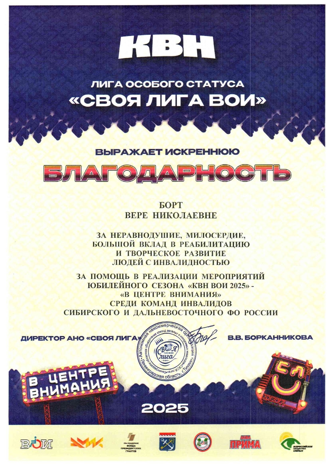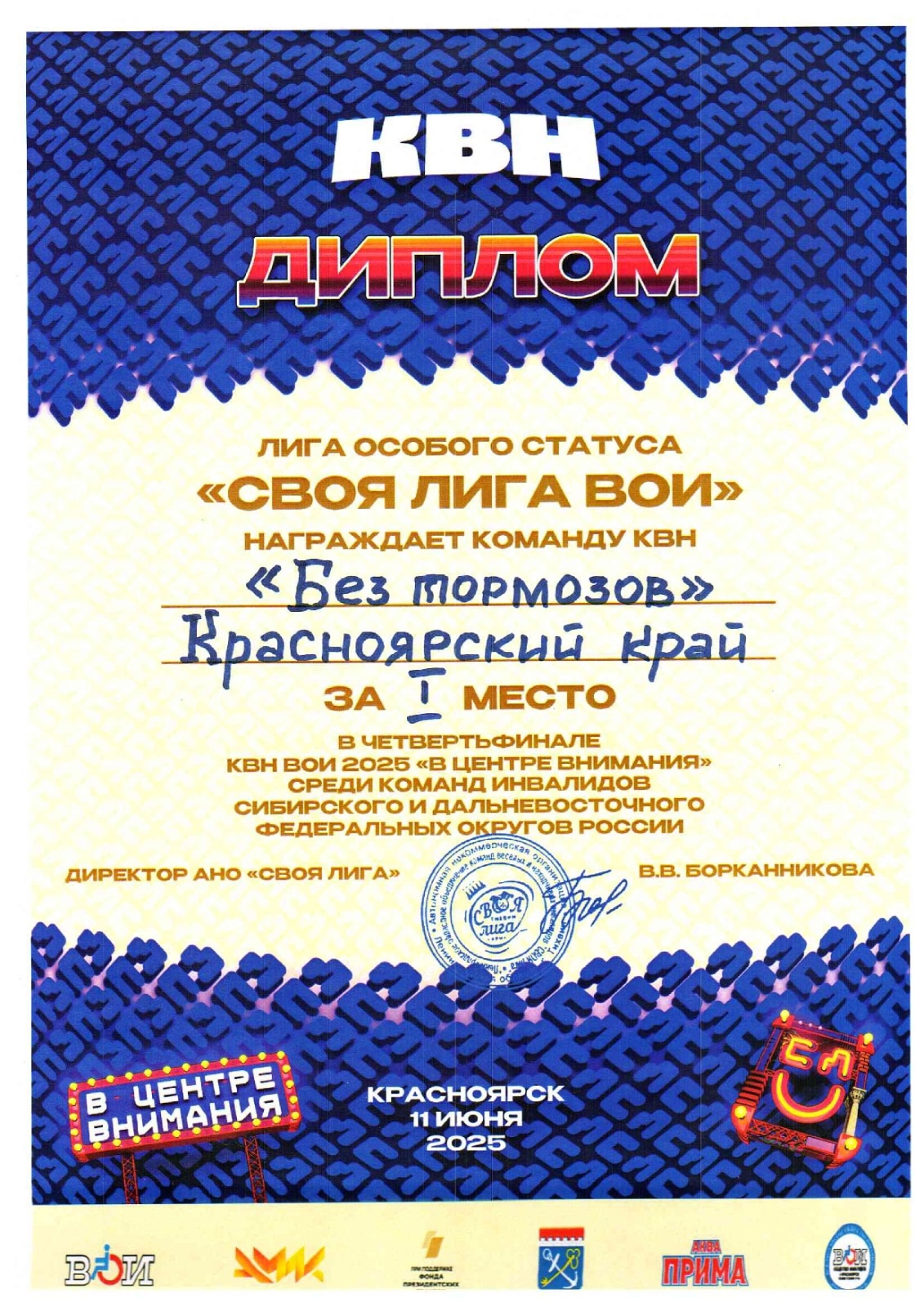 Участники шести команд Сибирского федерального округа России состязались за выход в полуфинал. Первое место занял красноярский коллектив «Без тормозов». Лучшим актером, по мнению жюри, признан красноярец Дмитрий Верховин. Особую благодарность жюри также выразили Вере Николаевне Борт, председателю красноярской организации ВОИ Советского района.