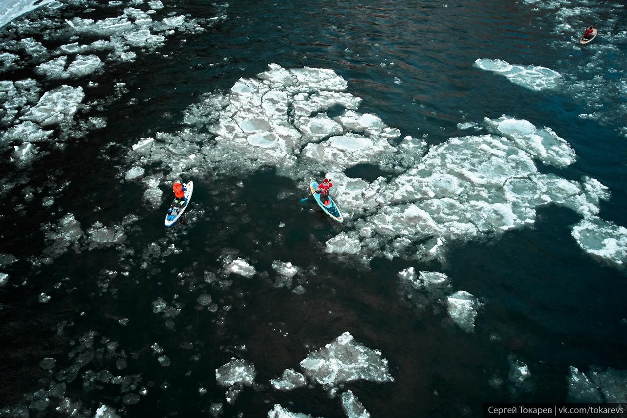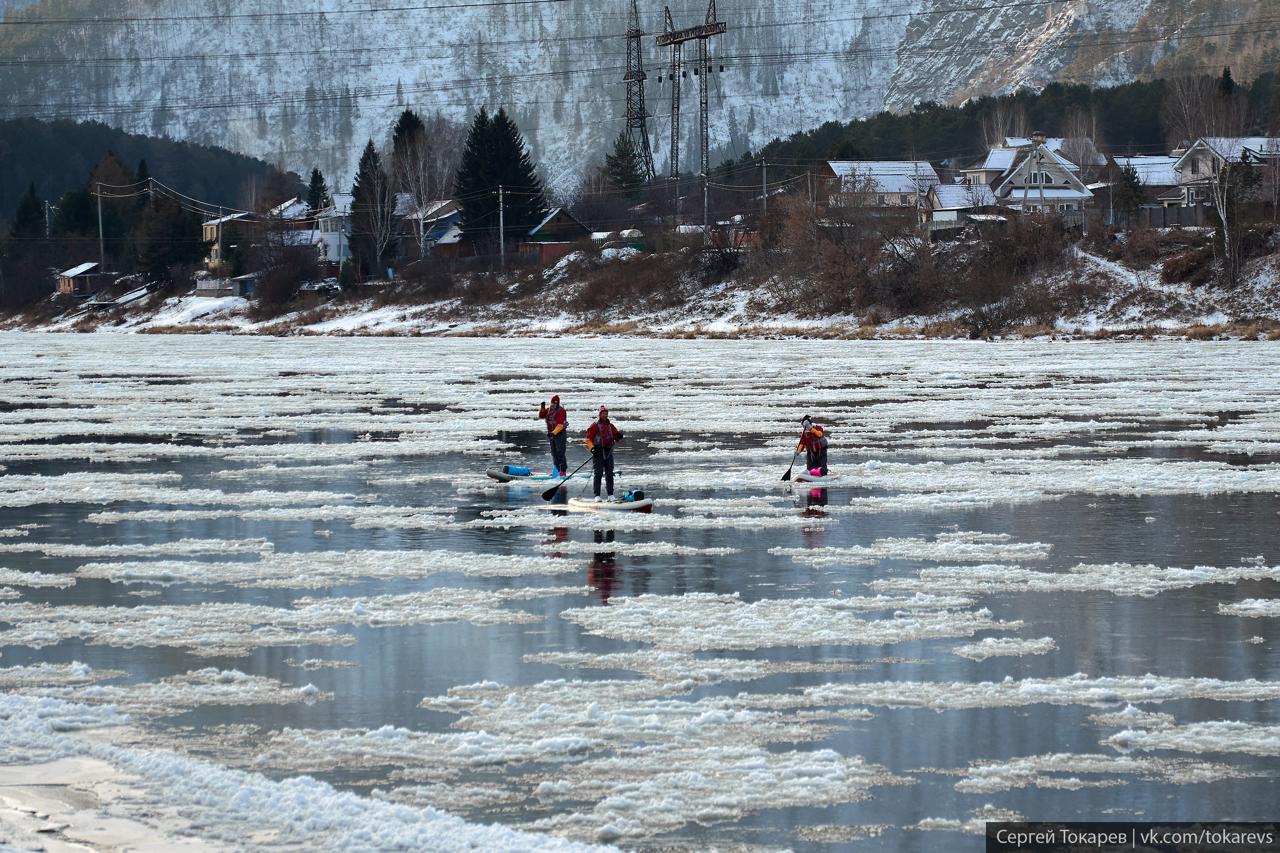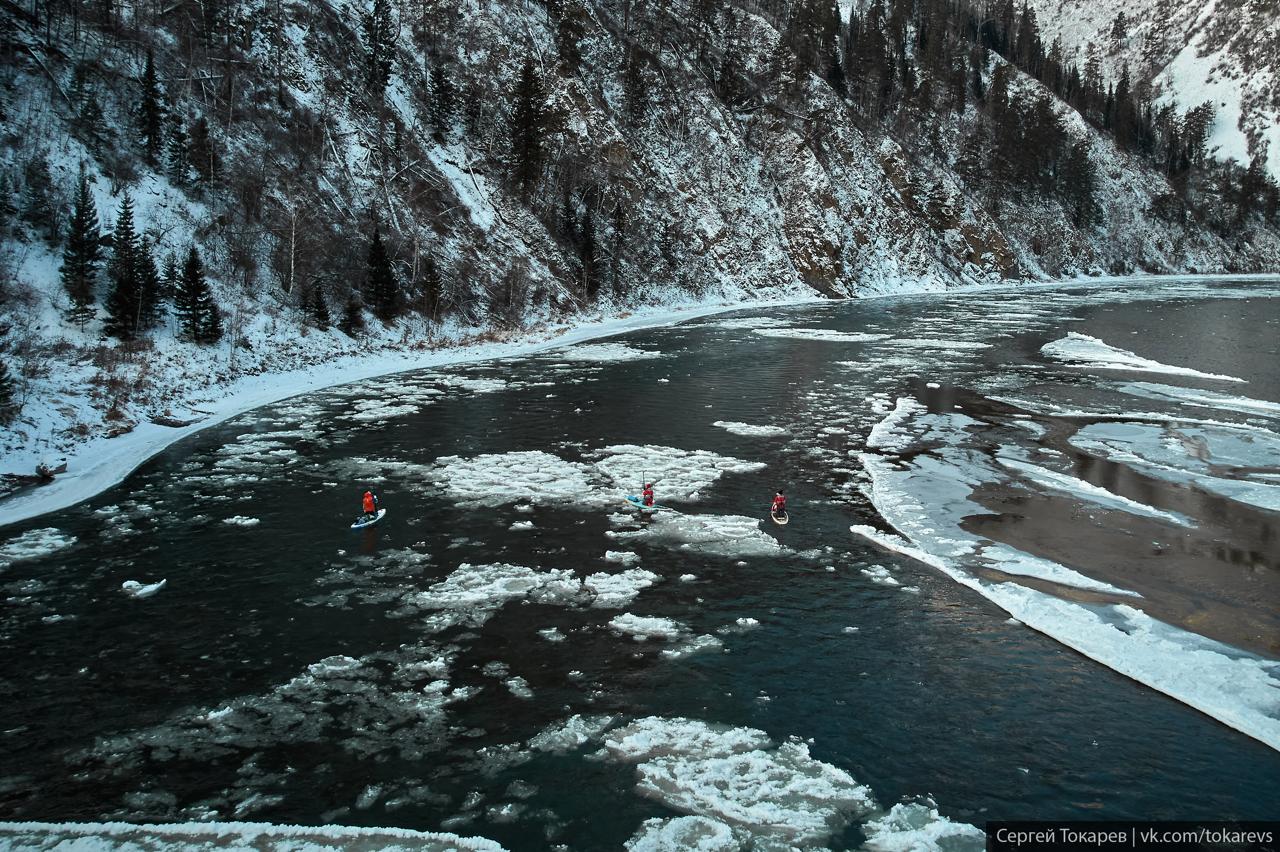 Красноярский фотограф Сергей Токарев накануне, 16 ноября, заметил людей, сплавляющихся на сапах по замерзшей Мане. Любители экстремального отдыха плыли на своих надувных досках, а по соседству шли огромные льдины.