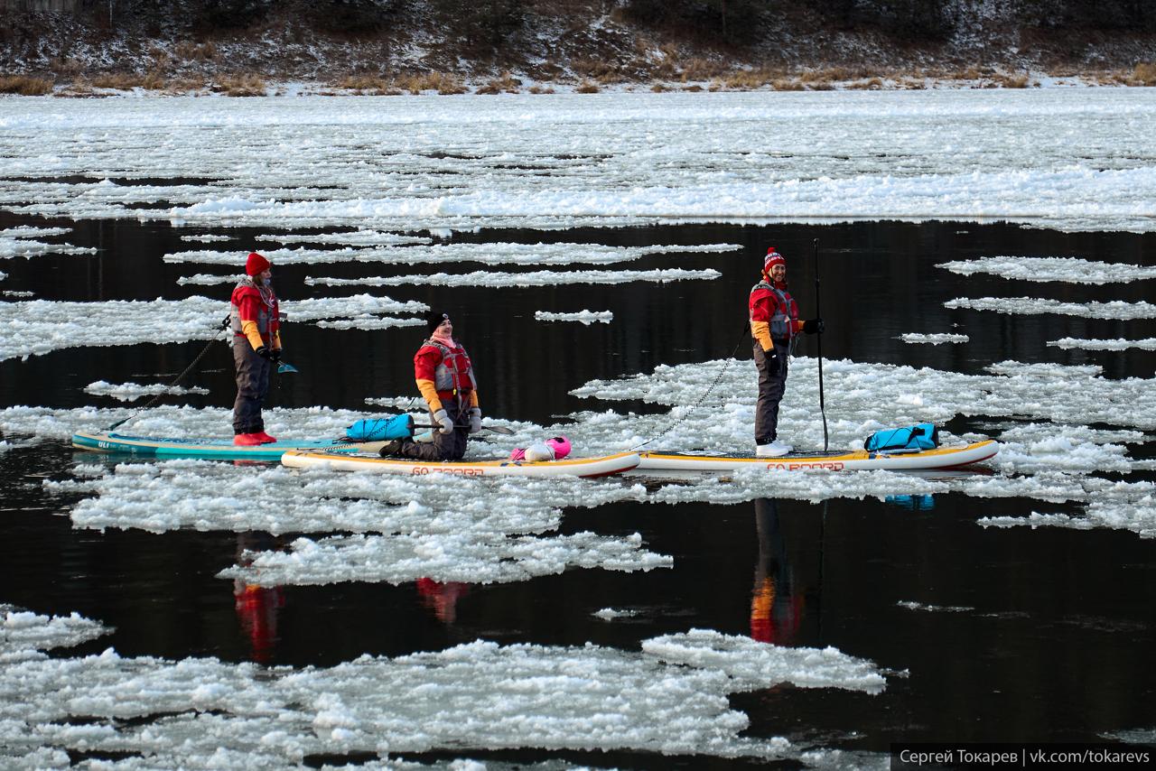 Красноярский фотограф Сергей Токарев накануне, 16 ноября, заметил людей, сплавляющихся на сапах по замерзшей Мане. Любители экстремального отдыха плыли на своих надувных досках, а по соседству шли огромные льдины.
