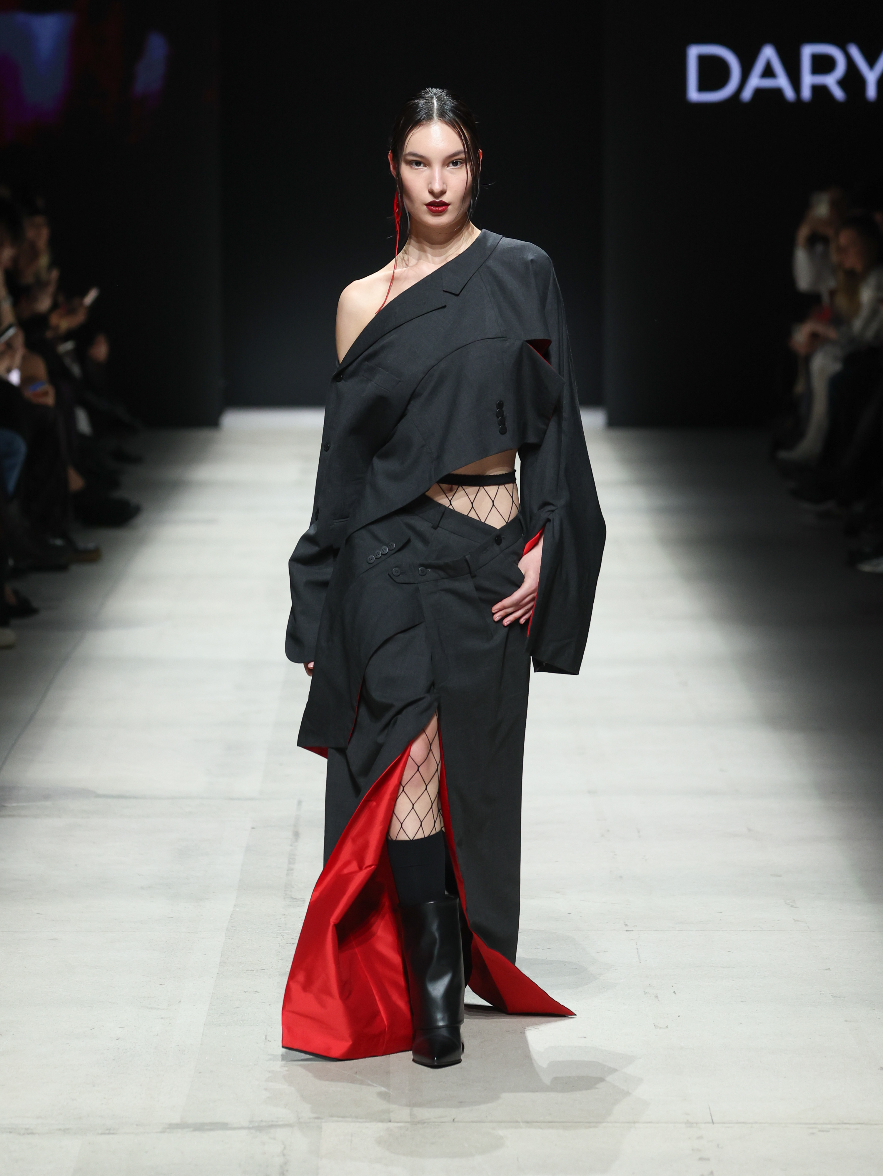 Дизайнер отказалась от белого цвета и сделала ставку на контраст фактур и внутреннюю трансформацию. Главные цвета коллекции — черный и красный, ключевой акцент — приталенные силуэты.
