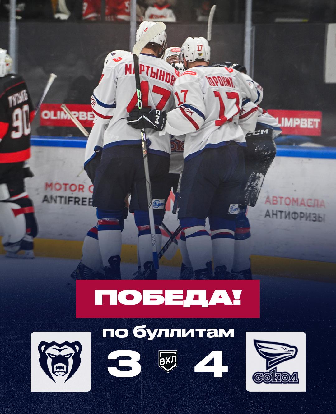 Позже «Молот» вышел вперед, но красноярцы быстро сравняли счет: шайбу реализовал Сергей Дубакин. Основное время матча завершилось вничью, и игра перешла в овертайм, а затем – в серию буллитов. Сильнее оказались хоккеисты «Сокола». Решающие буллиты реализовали Кирилл Казаков и Илья Скворцов.