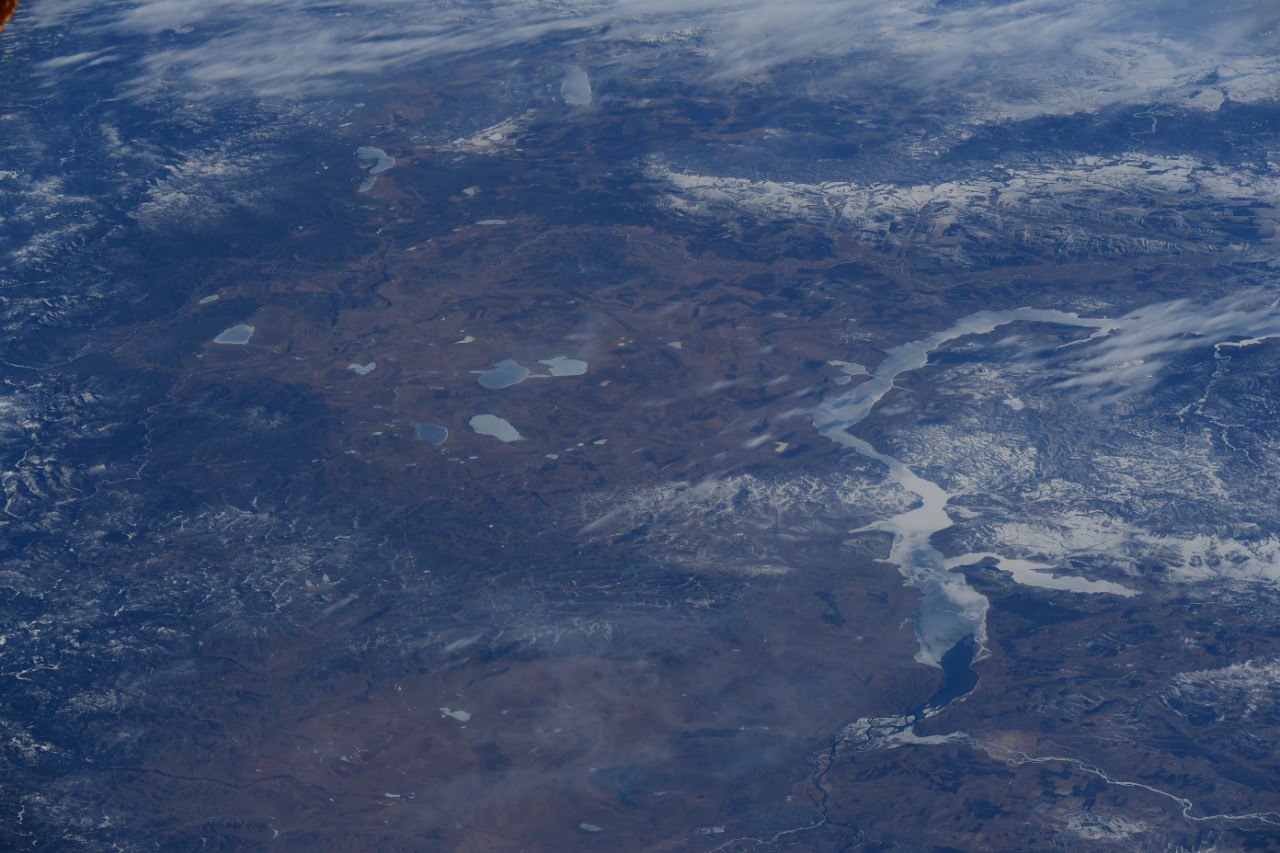 Красноярский космонавт Кирилл Песков показал Красноярский край из космоса. На фото угадываются озера Хакасии и Красноярское водохранилище.