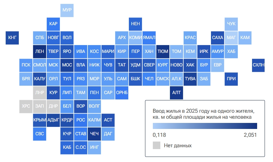 Диапазон значений показателей в регионах между лидерами и аутсайдерами рейтинга отличается в десятки раз. Первую строчку занимает Ленинградская область – 2,05 квадратного метра на человека. Это немного выше, чем в предыдущем году.В ТОП-10 регионов РФ, где введено более одного квадратного метра на человека, входят также Тюменская область, Республика Алтай, Чечня, Московская область, Тува, Адыгея, Калининградская область, Краснодарский край и Калужская область.