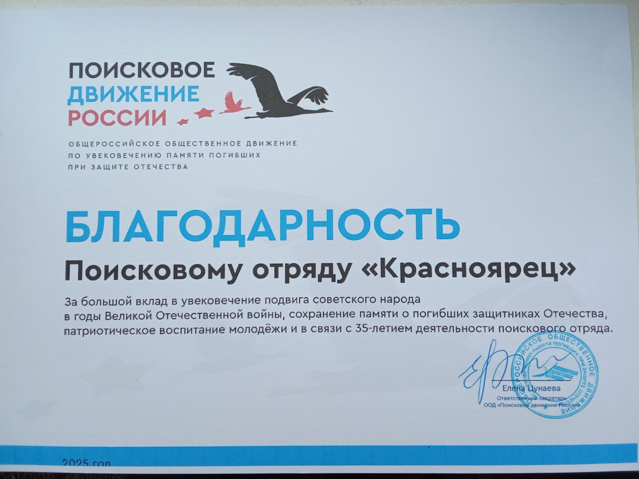 Благодарностью Поискового движения России отмечен первый поисковый отряд краевой столицы. «Красноярец» начал свою деятельность 35 лет назад и с 1991 года вносит большой вклад в увековечение подвига советского народа в годы Великой Отечественной войны, патриотическое воспитание молодежи и сохранение памяти о погибших защитниках Отечества. Его участники ездят в Новгородскую область, где воевали сибиряки.