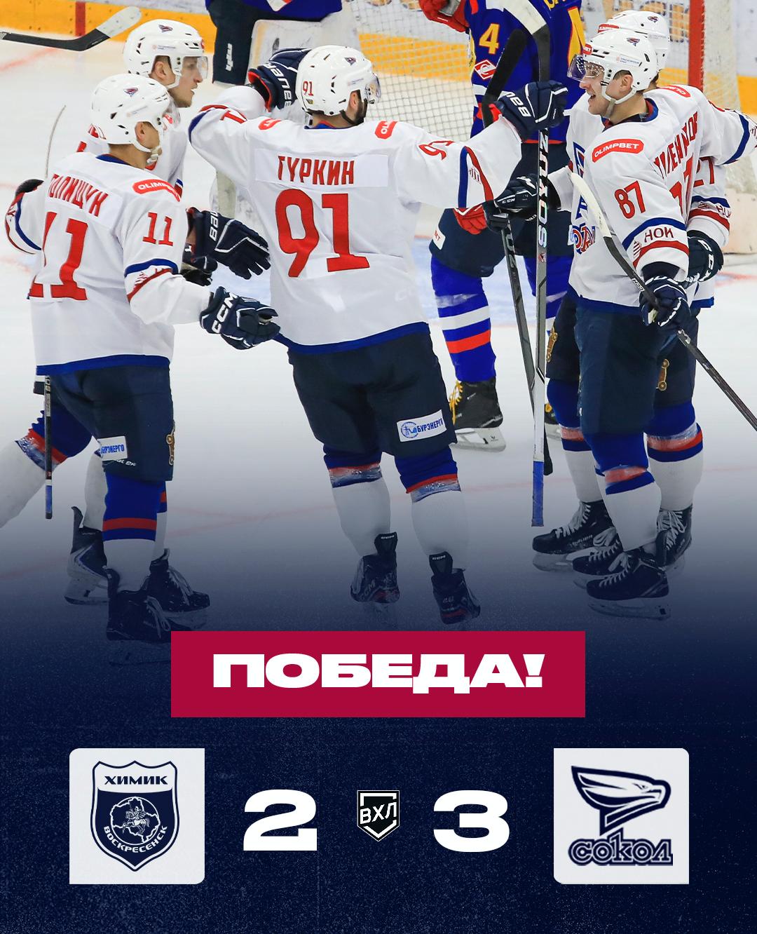 Хоккейный клуб «Сокол» одержал выездную победу в матче регулярного чемпионата ВХЛ. Встреча с воскресенским «Химиком» завершилась со счетом 3:2 в пользу красноярской команды.