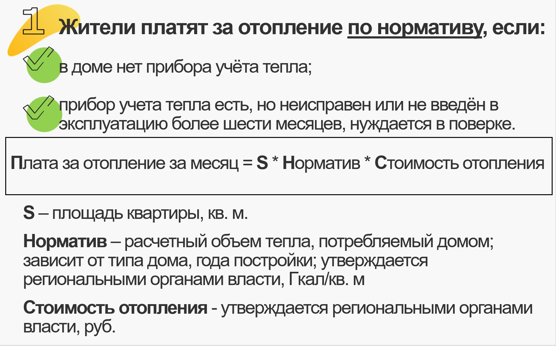 В домах без счетчиков тепло оплачивают равными частями весь отопительный сезон по нормативам.