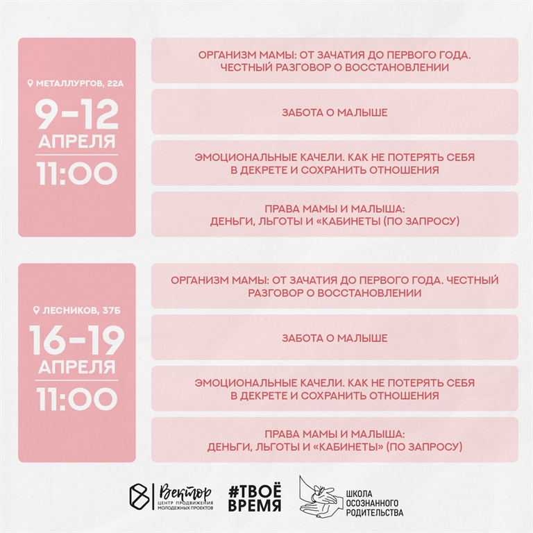Программа обучения потоков будет совпадать по содержанию, поэтому участники могут выбрать удобный для себя филиал. После окончания очных встреч курс будет доступен в онлайн‑формате в группе проекта «Семейная лаборатория».