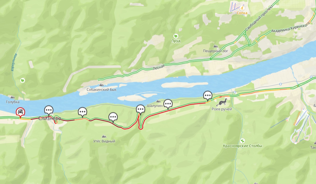 Красноярцы массово возвращаются с отдыха перед рабочей неделей. Машин так много, что на дивногорской трассе в сторону Красноярска образовался многокилометровый затор. По данным 2ГИС, наиболее сложная ситуация в Слизнево: уровень пробок отмечен тёмно-бордовым цветом. То же самое происходит на подъезде к СНТ "Мебельщик".