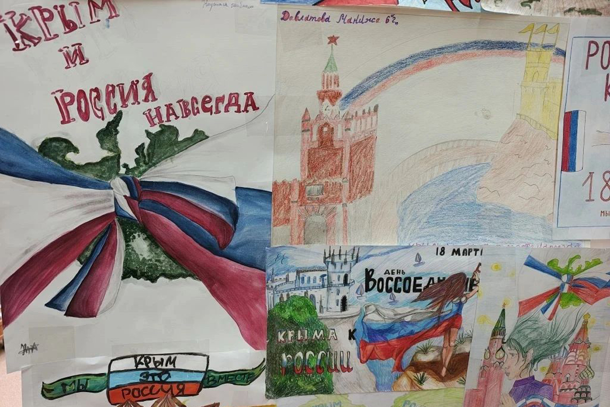 Также в школах города можно увидеть детские рисунки с красивыми пейзажами полуострова, символами России и Крыма, сценами из жизни крымчан.