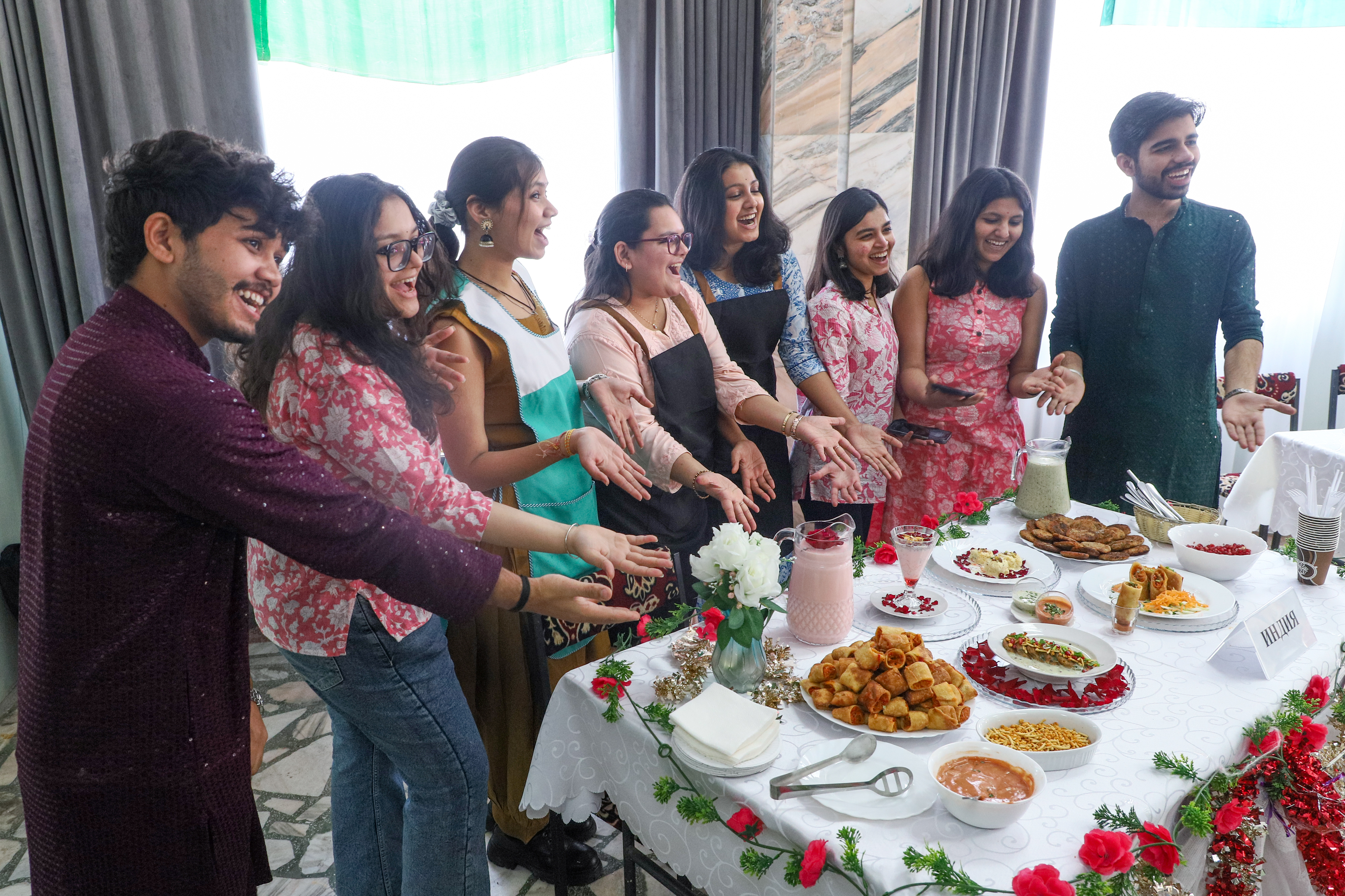 Каждая команда представила свою кулинарную историю. У стола с индийскими блюдами пахло ароматными специями и цветами — лепестки красовались на каждой тарелке, а также были рассыпаны по белоснежной скатерти. Особое внимание привлёк необычный напиток нежных оттенков, на поверхности которого воцарился бутон розы.