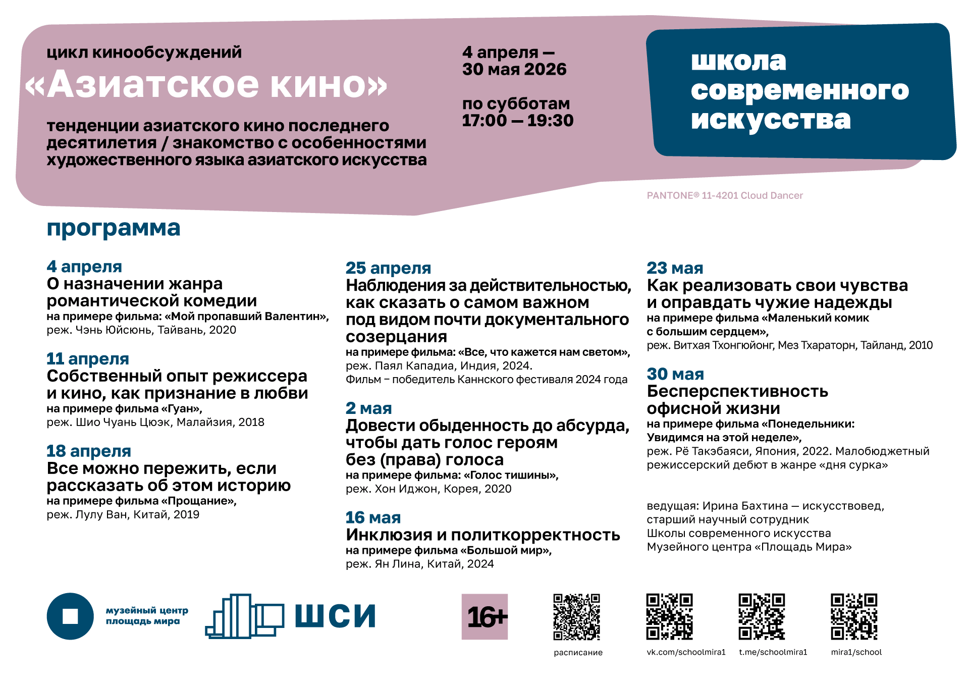 В мае «Площадь Мира» продолжает цикл кинообсуждений «Азиатское кино». Участники встречаются по субботам, с 17:00 до 19:30. Вход по специальным билетам. Ведущая – Ирина Бахтина, искусствовед и старший научный сотрудник Школы современного искусства музейного центра.