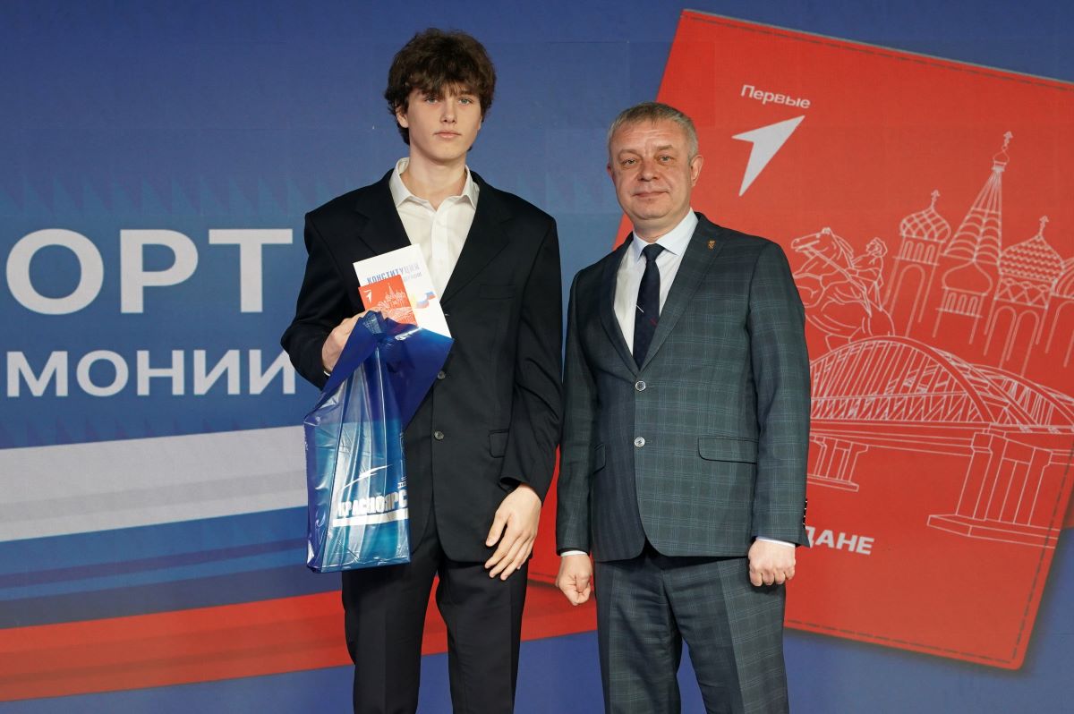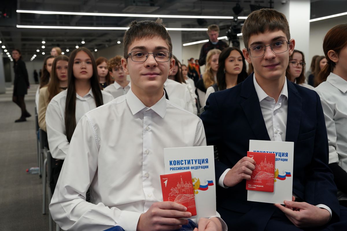 Помимо паспорта молодые люди получили по экземпляру Конституции РФ, а также нагрудный значок «Движения первых».