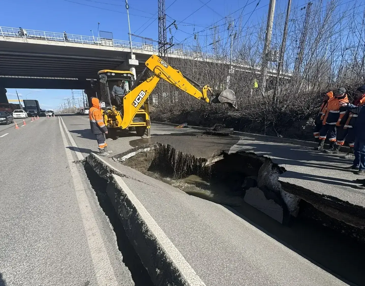Движение на участке ограниченно: проезд организован по одной полосе в каждую сторону. Из-за этого на прилегающих улицах уже фиксируют заторы.