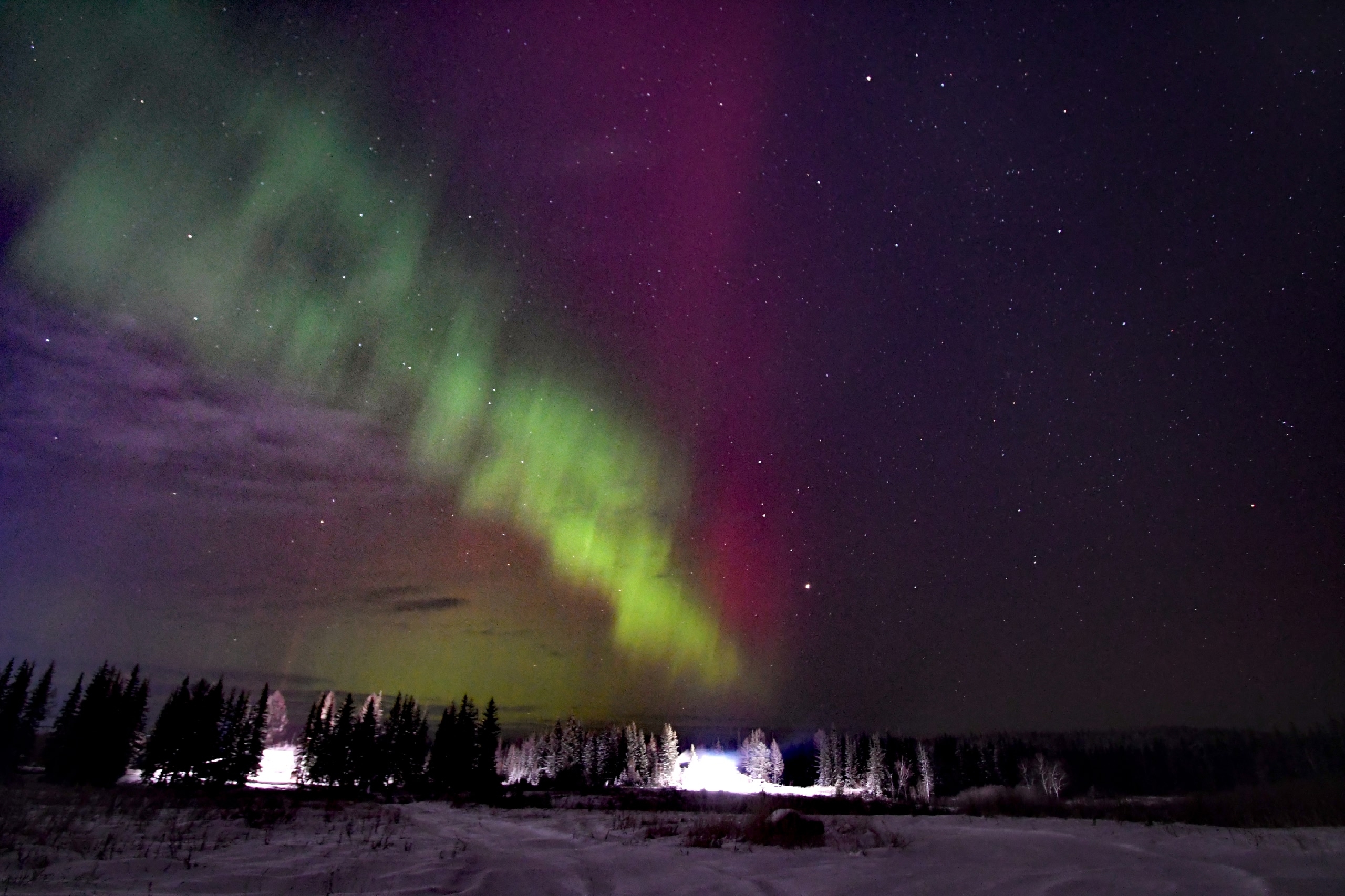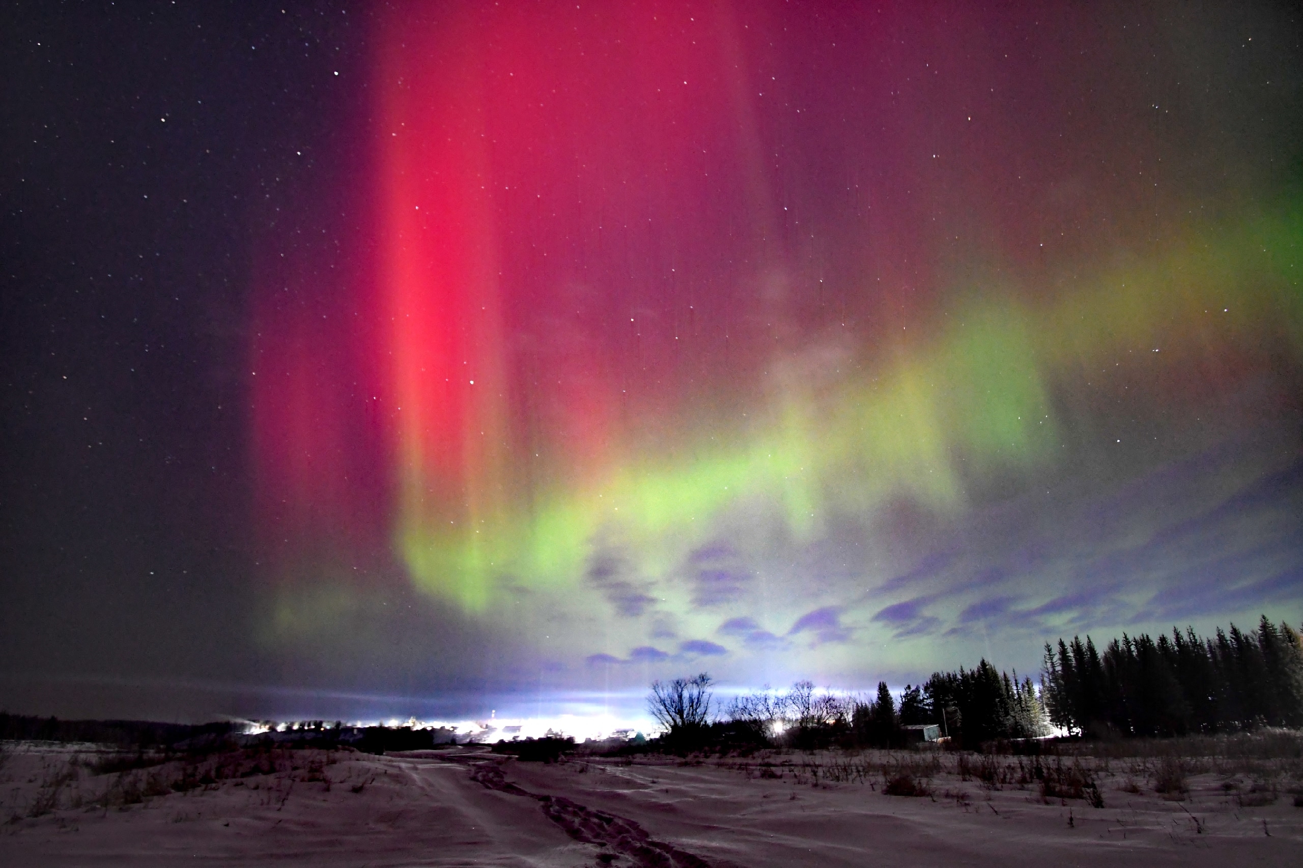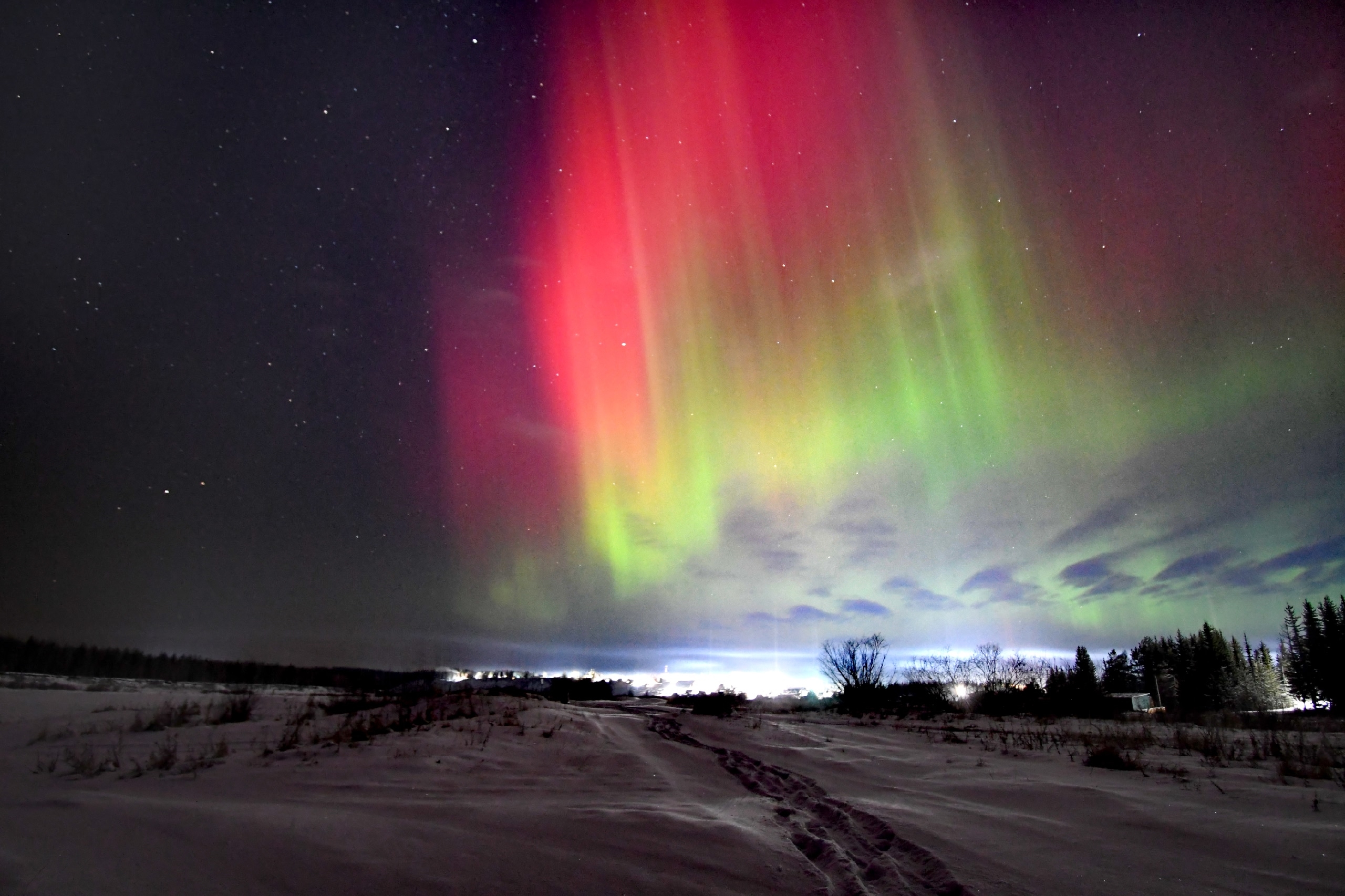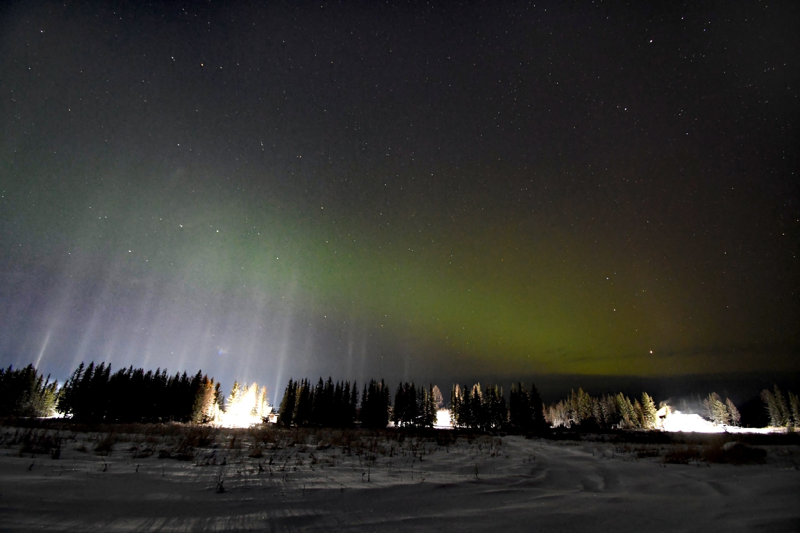 Позже в небе появились световые столбы — оптическое явление, вызванное отражением света от ледяных кристаллов в атмосфере. И завершило необычную ночь северное сияние, вызванное мощной магнитной бурей.
