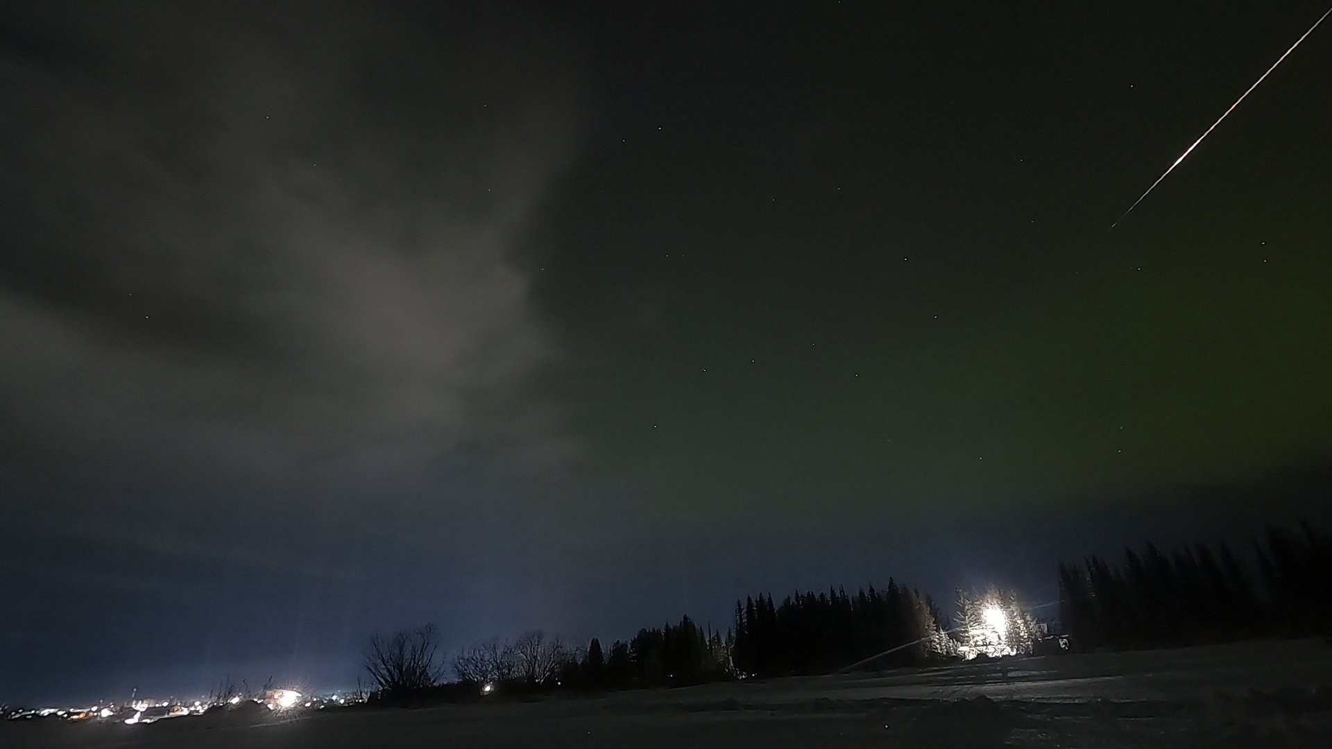 Позже в небе появились световые столбы — оптическое явление, вызванное отражением света от ледяных кристаллов в атмосфере. И завершило необычную ночь северное сияние, вызванное мощной магнитной бурей.