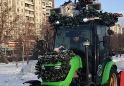 Трактор работает под популярные новогодние песни, которые транслируются через динамик. Таким образом коммунальщики решили совместить полезную работу по уборке с праздничным оформлением города.