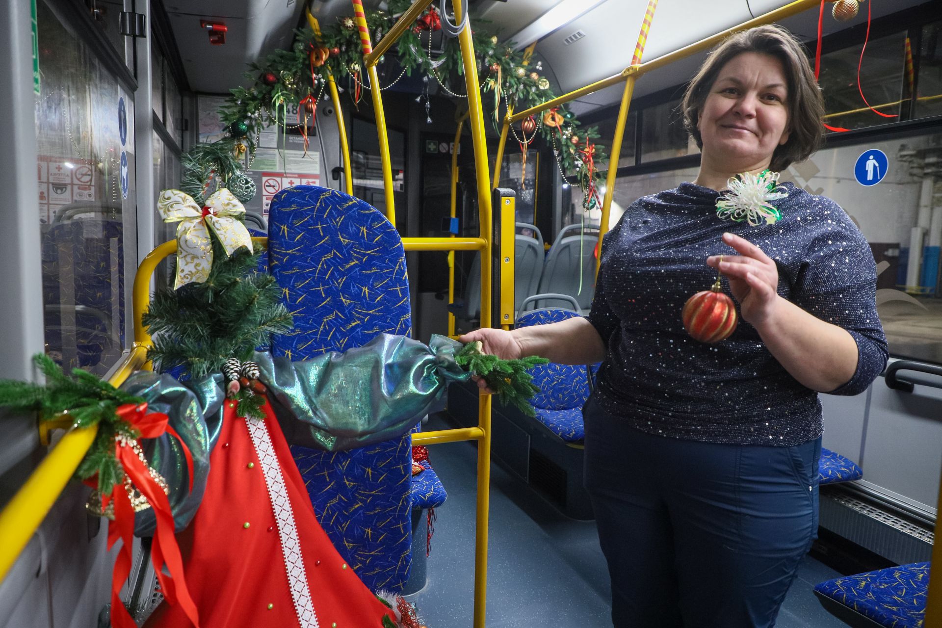 В этом автобусе даже воздух будто искрится от праздника. На поручнях — яркие ленты и шары, а сам салон превращён в настоящее путешествие в сказку. Кажется, здесь поработал профессиональный декоратор. И это действительно так. Только в роли оформителя — водитель Елена Фалеева.
