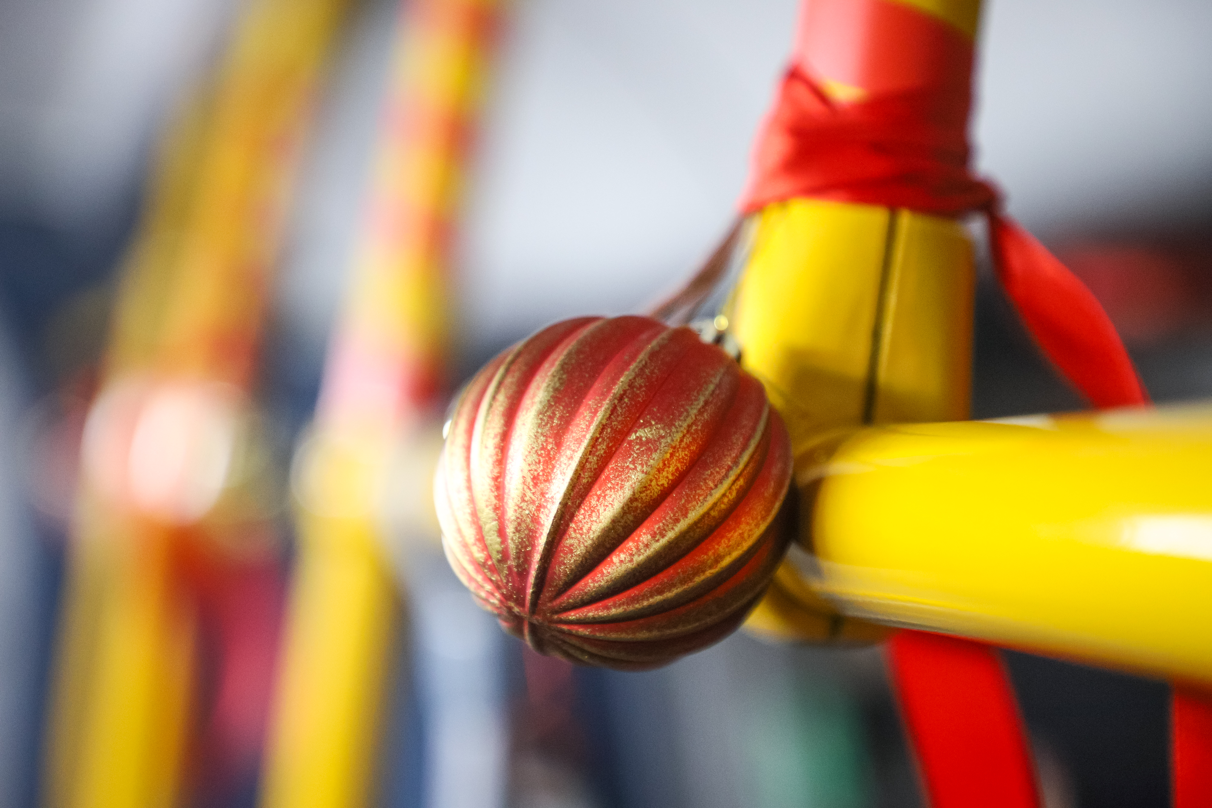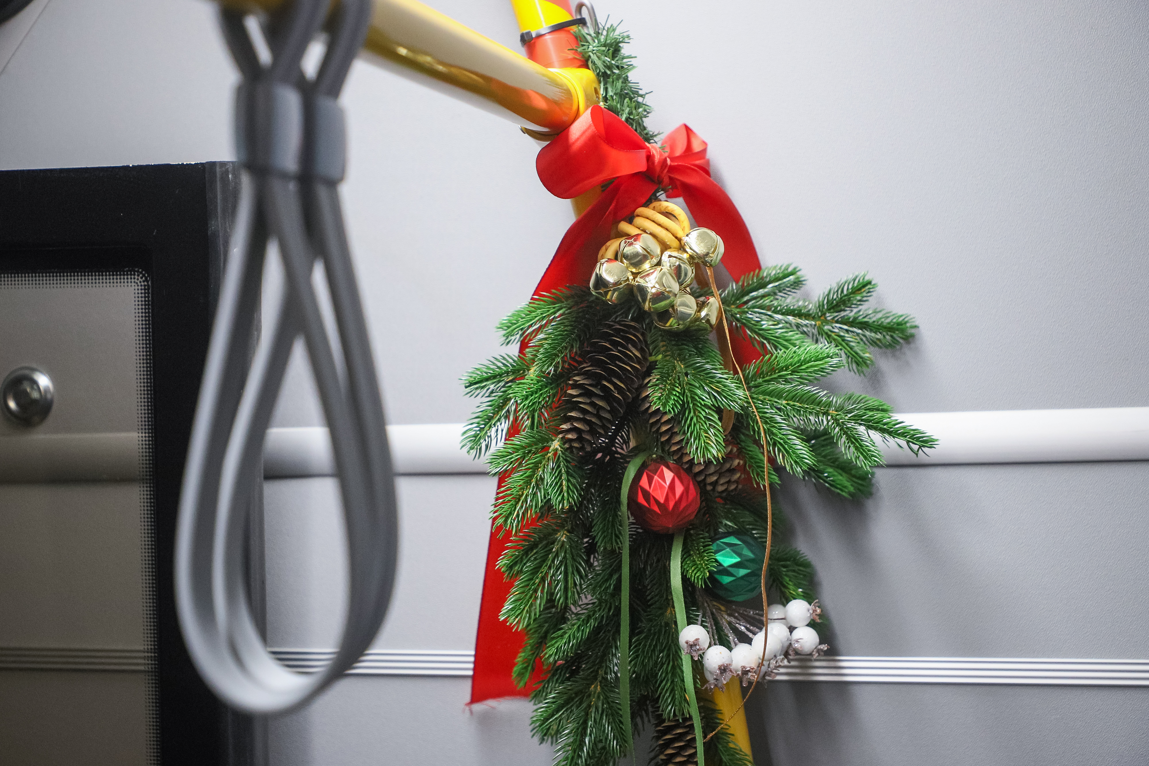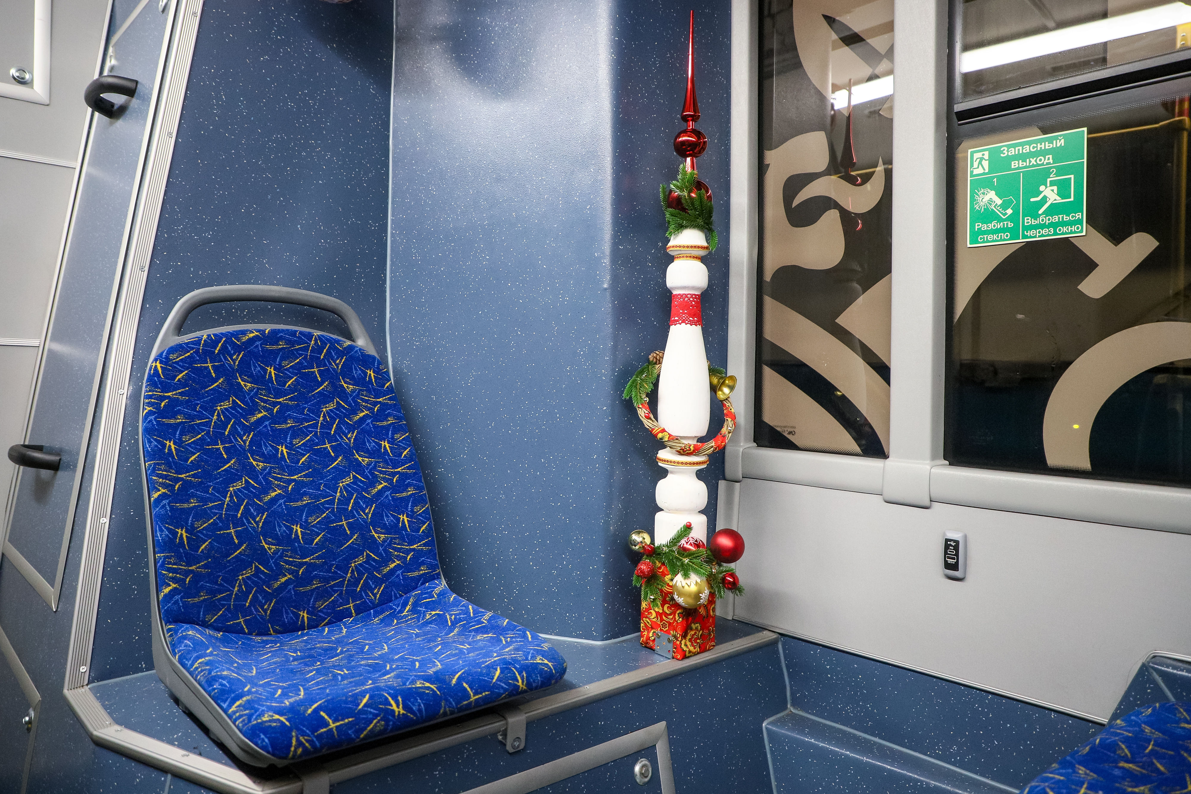 Каждая деталь здесь сделана её руками и продумана до мелочей. В передней части салона пассажиров встречает нарядная арка, украшенная бубенцами, настоящими баранками, еловыми веточками и алыми лентами — словно упряжка только что промчалась мимо, оставив за собой праздничный перезвон. На центральной площадке стоит красавица-ёлочка в платье с русским народным узором. Везде мерцают разноцветные шары. А в “хвосте” автобуса — необычная инсталляция: старая ножка от стола, получившая вторую жизнь и превращённая в праздничный символ. Всё выглядит лаконично, стильно и по-настоящему празднично.