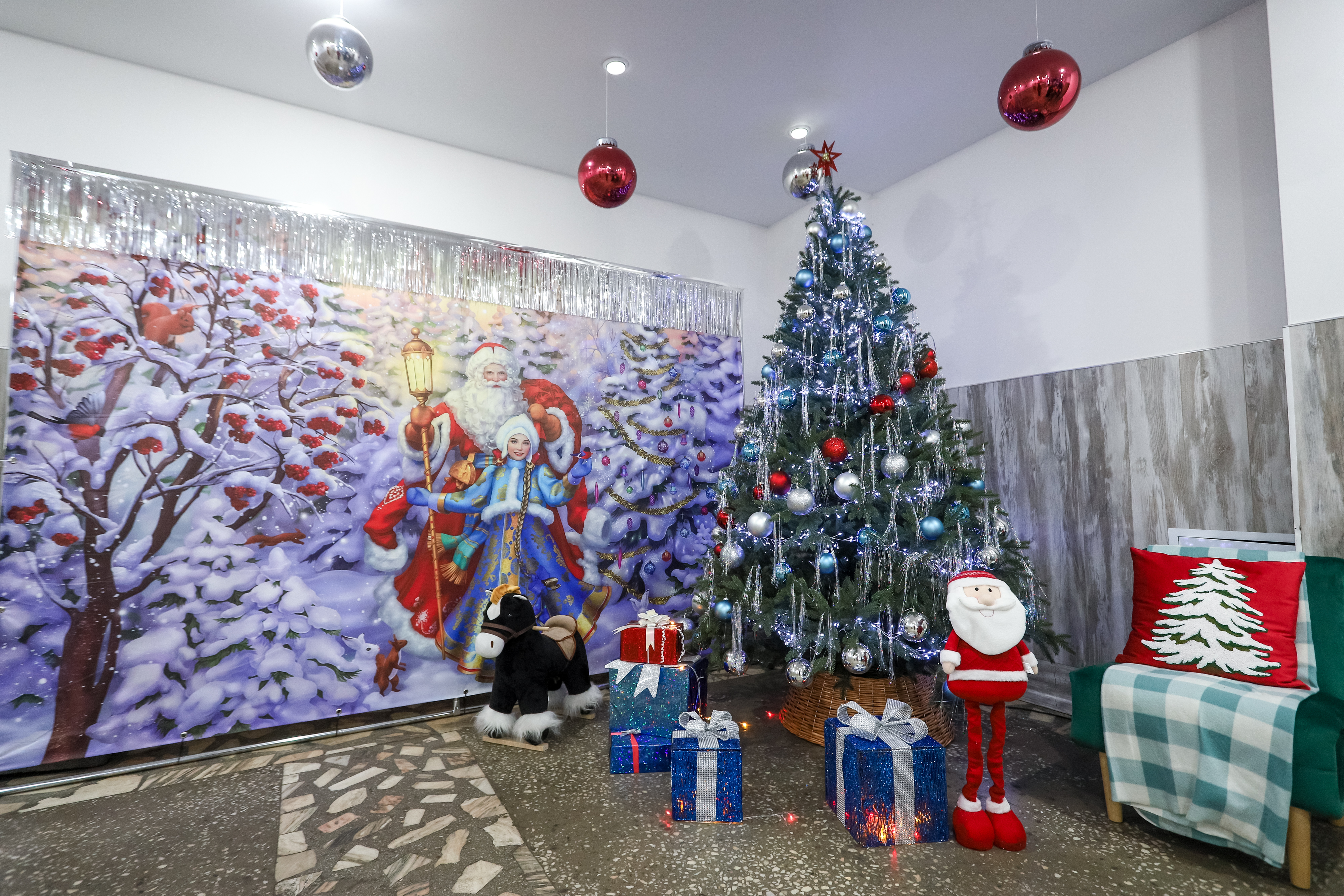 Творческая атмосфера царит не только в автобусах. В декабре само предприятие напоминает уютный, нарядный дом. На каждом из трёх этажей — своя ёлка и своя фотозона. Первый этаж превратился в полноценное праздничное пространство, куда можно прийти с детьми, чтобы сделать памятные снимки. На втором сотрудников встречает белая новогодняя красавица, а рядом с ней — нарядные гном, снеговик и олень. На третьем этаже — почти домашняя атмосфера: ёлка, искусственный камин и светящаяся фигура оленя