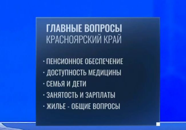 Самой популярной темой вопросов от красноярцев стало пенсионное обеспечение. На втором месте — вопросы доступности медицины. Также в топ-5 тем, которые поднимали жители региона, вошли: семья и дети, занятость и зарплаты, общие вопросы по жилью.