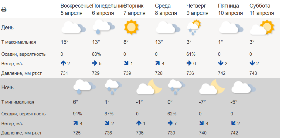 В пятницу, 10 апреля, обещают +1 градус днём, до -5 — ночью. Ветер северный, 2 м/с.
