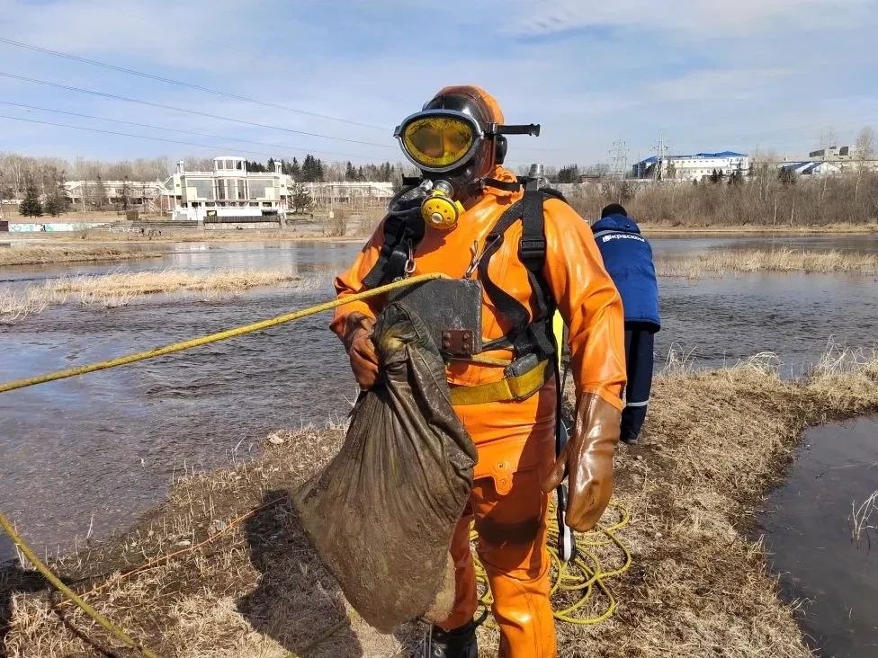 В Красноярске водолазы «КрасКома» начали работы перед весенним половодьем и уже в первый день подняли со дна Енисея необычный «улов»: старую покрышку, рыбацкие удочки и синтепоновую подушку.