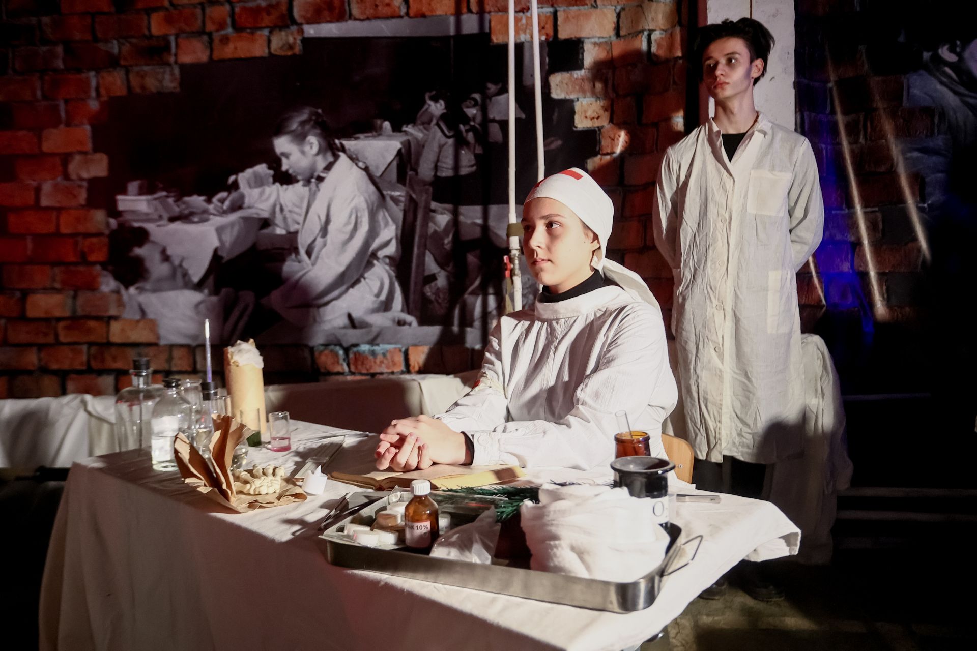 Тогда школьный подвал на две недели превратился в настоящий музей, где создали атмосферу военных лет. Экспозиция объединила семь локаций, рассказывающих о жизни Ленинграда: быт, очереди за хлебом, работа госпиталей, школ и труд детей на заводах. Каждая локация раскрывала небольшой сюжет — например, при создании площадки “Блокадный хлеб” использовалась книга “Седьмая симфония” — фрагмент, где блокадница Нина Воронова в очереди просит дать ей порцию на послезавтра. Получив заветный ломоть, моментально его съедает. Роль Нины сыграла мама школьника Марка Эрика Толокольникова.