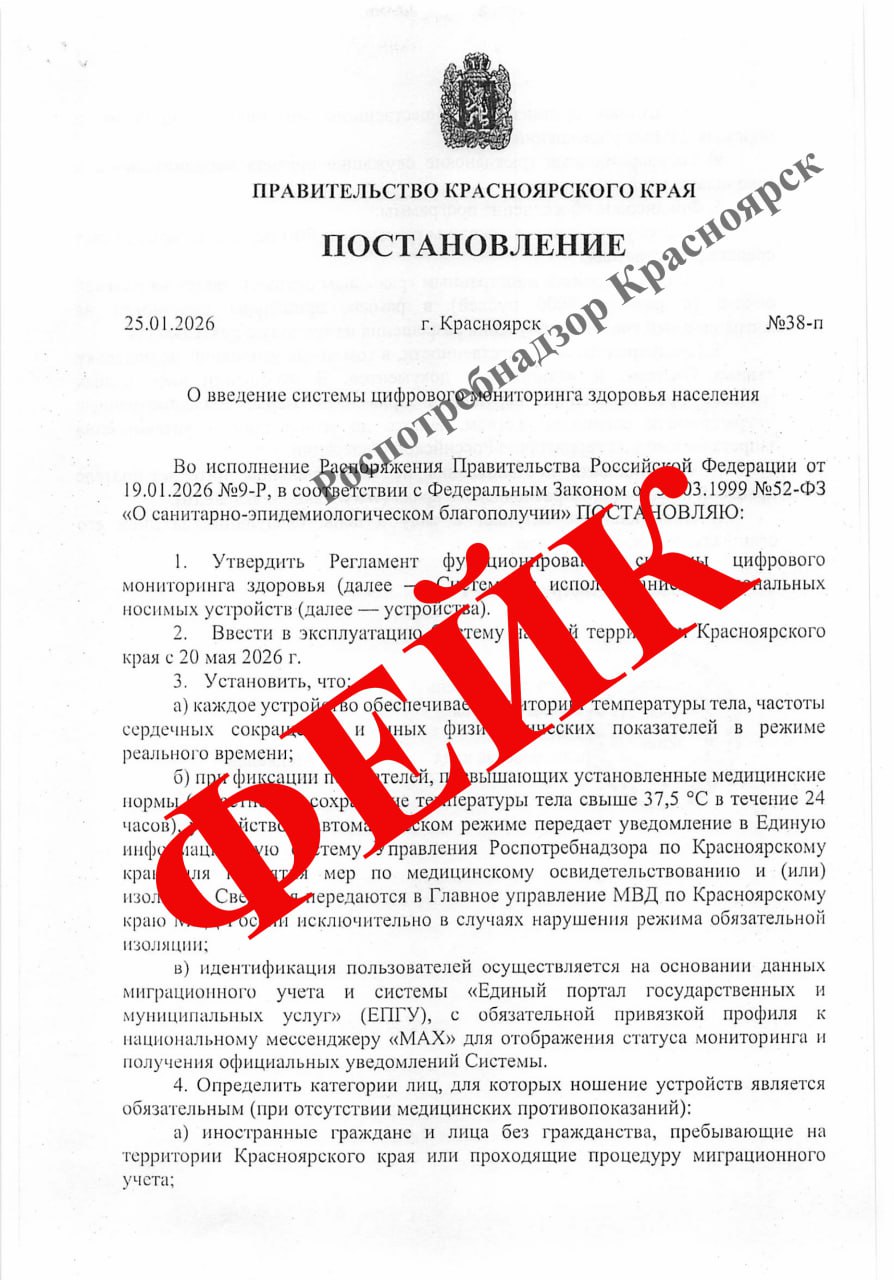 Лжедокумент утверждает, что с мая 2026 года работники общепита, медицины, образования, госслужащие, а также иностранцы должны будут носить устройства для мониторинга температуры и пульса. Данные якобы будут передаваться в Роспотребнадзор, а при температуре выше 37,5 градуса более суток человека могут изолировать.